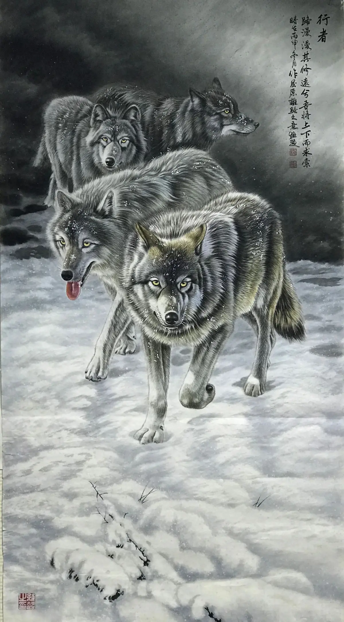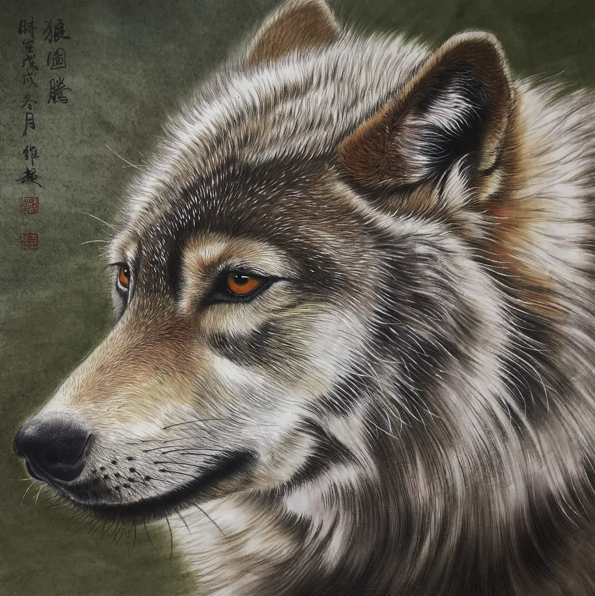 在这一转型过程中,当代画家吕维超的创作具有代表性意义。他专精于野生动物工笔画,对狼的描绘构成了其艺术体系的核心。吕维超的创作实现了以下几个关键突破: