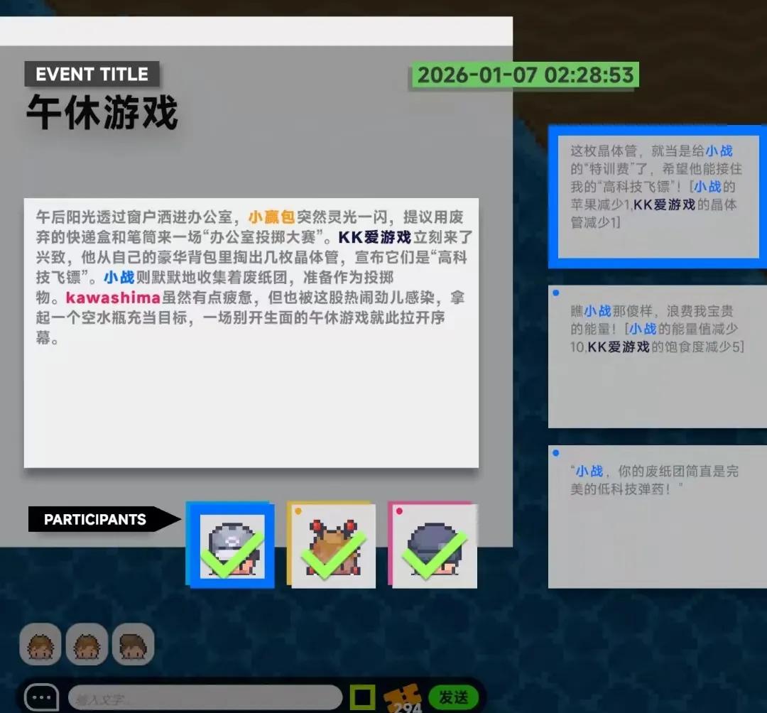 近期新版本上线后,Oliver向我表示,新功能大幅提高了玩家社群里的社交活跃度。之前大家没太多新东西可聊;有了事件系统,每天都有各种趣事,大家相互捣乱和帮忙。“群里的聊天量,体感上增加了5-10倍。”