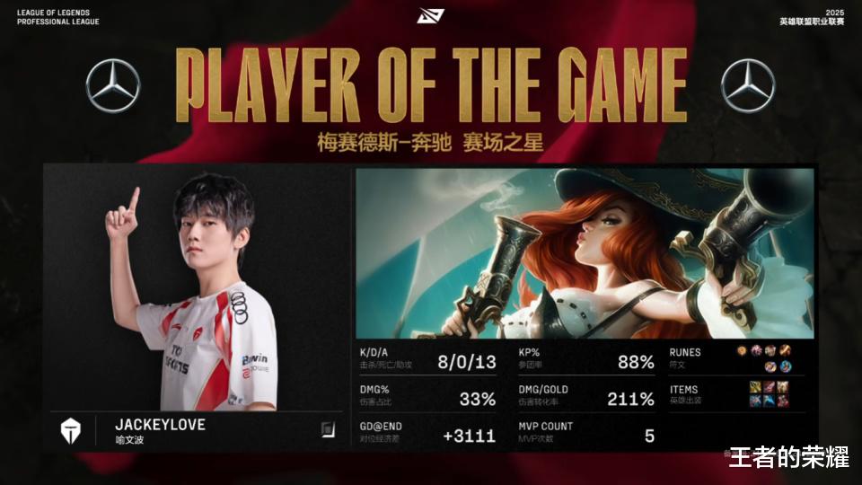 JackeyLove在获胜的3局比赛中多次成为团战核心,无论是女枪的爆炸输出、还是德莱文的滚雪球能力,均展现出顶级AD的稳定性。尤其在决胜局中,他的德莱文通过精准走位和团战收割,为TES锁定胜局,最终当选FMVP实至名归。
