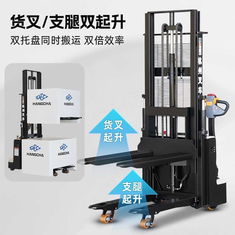 新品通过货叉及提升支腿的方式,可实现同时对双托盘货物进行堆垛和搬运,效率是普通堆垛车的2倍。