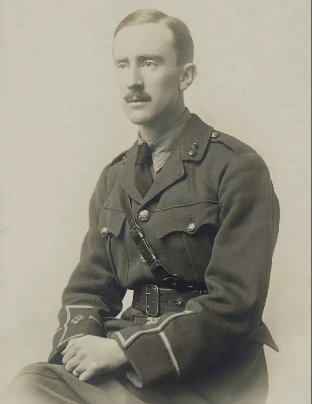 托尔金凭借出色的学术能力进入牛津大学,起初学习古典学,后来因其语言天赋转向语言学。1914年第一次世界大战爆发时,他因学业原因推迟了入伍。但在第二年毕业后,面对来自亲属越来越大的社会压力,他被任命为兰开夏郡火枪团的少尉,并被派往西线。