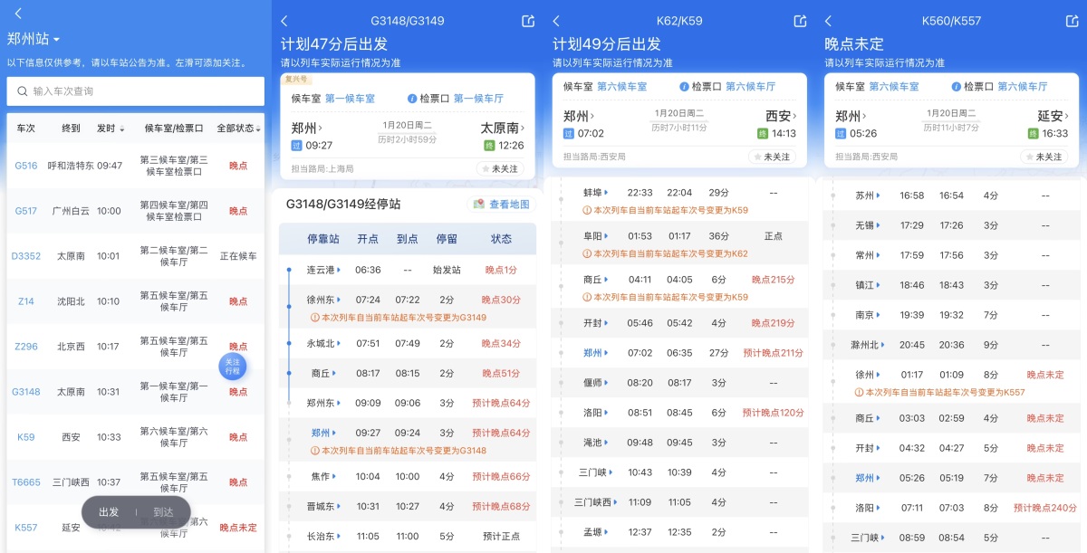 1月20日上午9时30分,记者在12306App 上看到,多趟途径郑州站及郑州东站的列车处于晚点状态,晚点时间一个小时到4个小时不等。