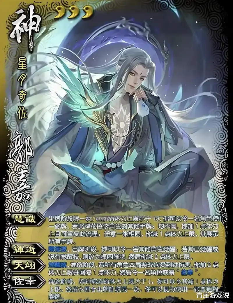 2021年,三国杀上线了神郭嘉,神郭嘉觉醒后的强度极高,常规情况下【佐幸】的印牌能力无人可及。【慧识】+【辉逝】的组合技更是可怕,那时候出现了“奉孝不才,一轮十牌”的论调,强度可见一斑。
