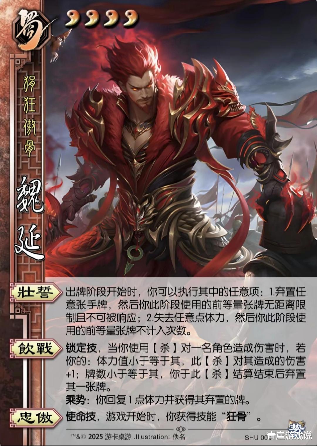 2025年,势魏延的上线彻底撕碎了游戏平衡,【壮誓】、【饮战】、【忠傲】、【狂骨】一套组合技强命、加伤、拆迁、摸牌、回复集于一身,数值极其离谱,势魏延选到就赢是他的座右铭。