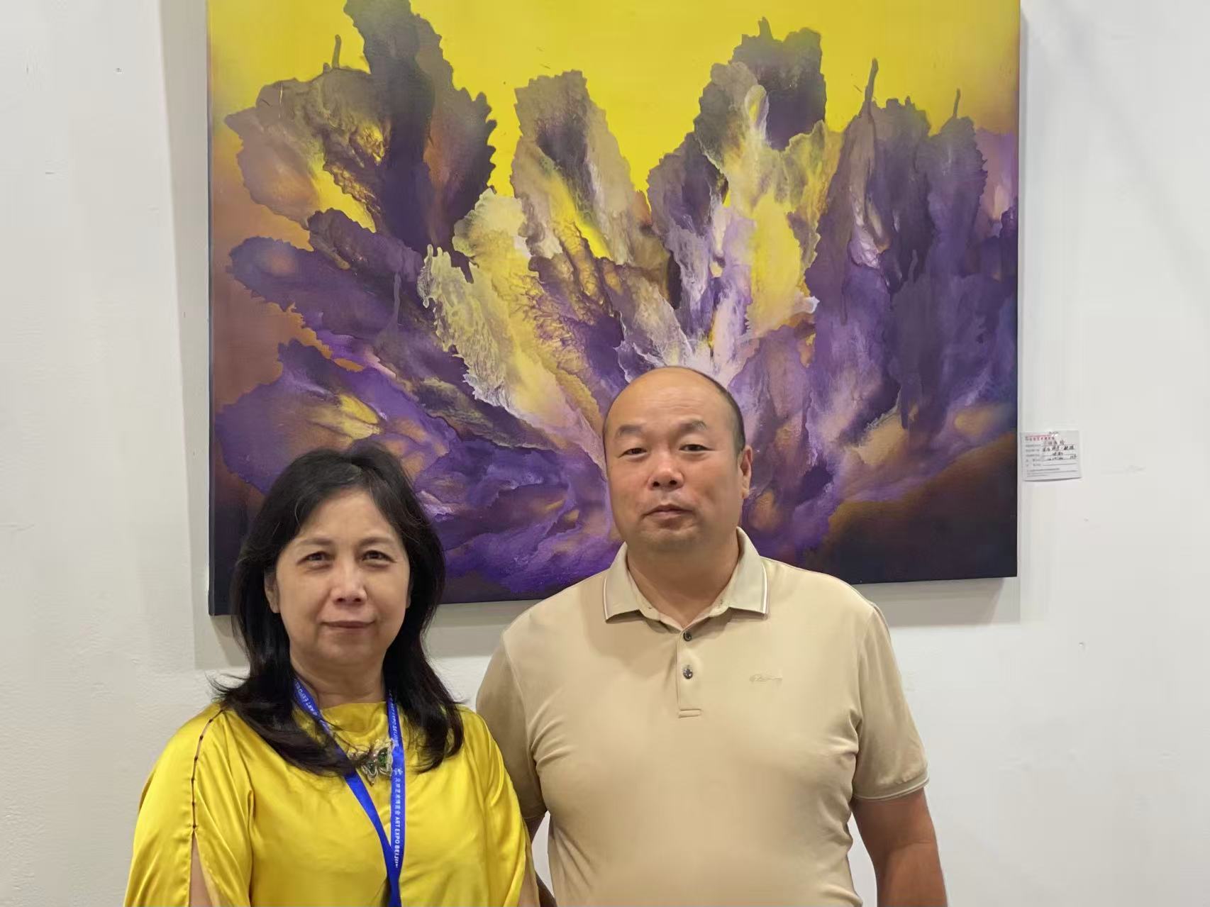 在油画创作中,这种“理性与感性的碰撞”则表现为“色彩逻辑”与“情感表达”的结合。以她那幅以花卉为意象的抽象油画为例,紫色与黄色的搭配并非随意为之——从色彩理论上,紫色与黄色是对比色,能形成强烈的视觉冲击,这是理性的色彩逻辑;但从情感表达上,紫色象征着生命的沉淀与神秘,黄色代表着生命的活力与希望,两者的碰撞与交融,恰是她对“生命本质”的感性思考。画面中,笔触看似肆意挥洒,实则每一笔的力度、方向都经过考量:厚重的笔触传递出生命的力量,轻盈的晕染则表现出生命的灵动。这种“理性规划下的感性表达”,让她的抽象画既避免了纯粹抽象的“晦涩难懂”,又摆脱了具象绘画的“束缚局限”,成为连接创作者与观者的情感桥梁。