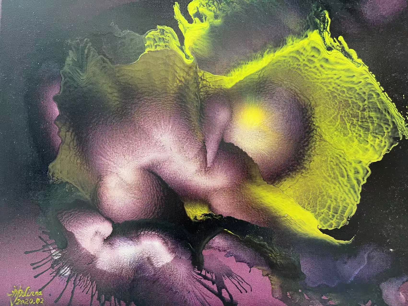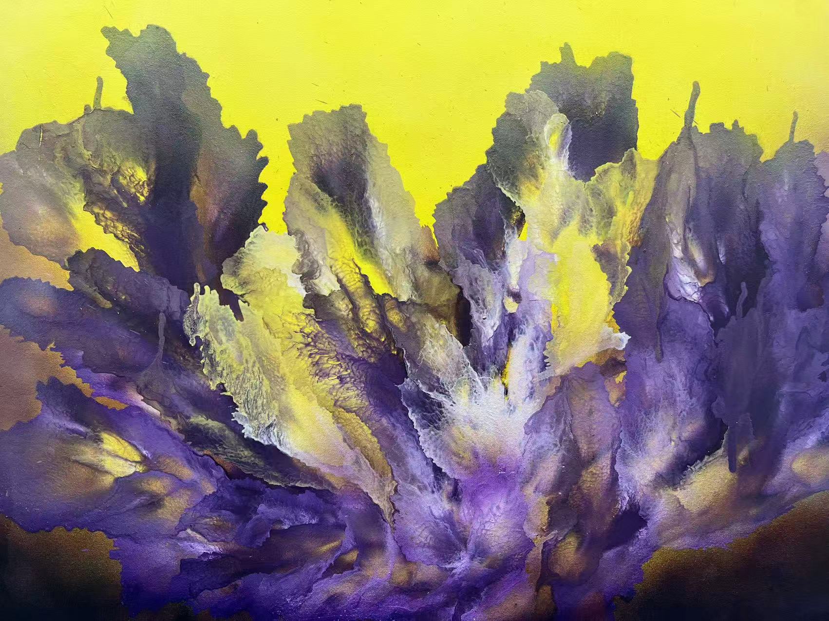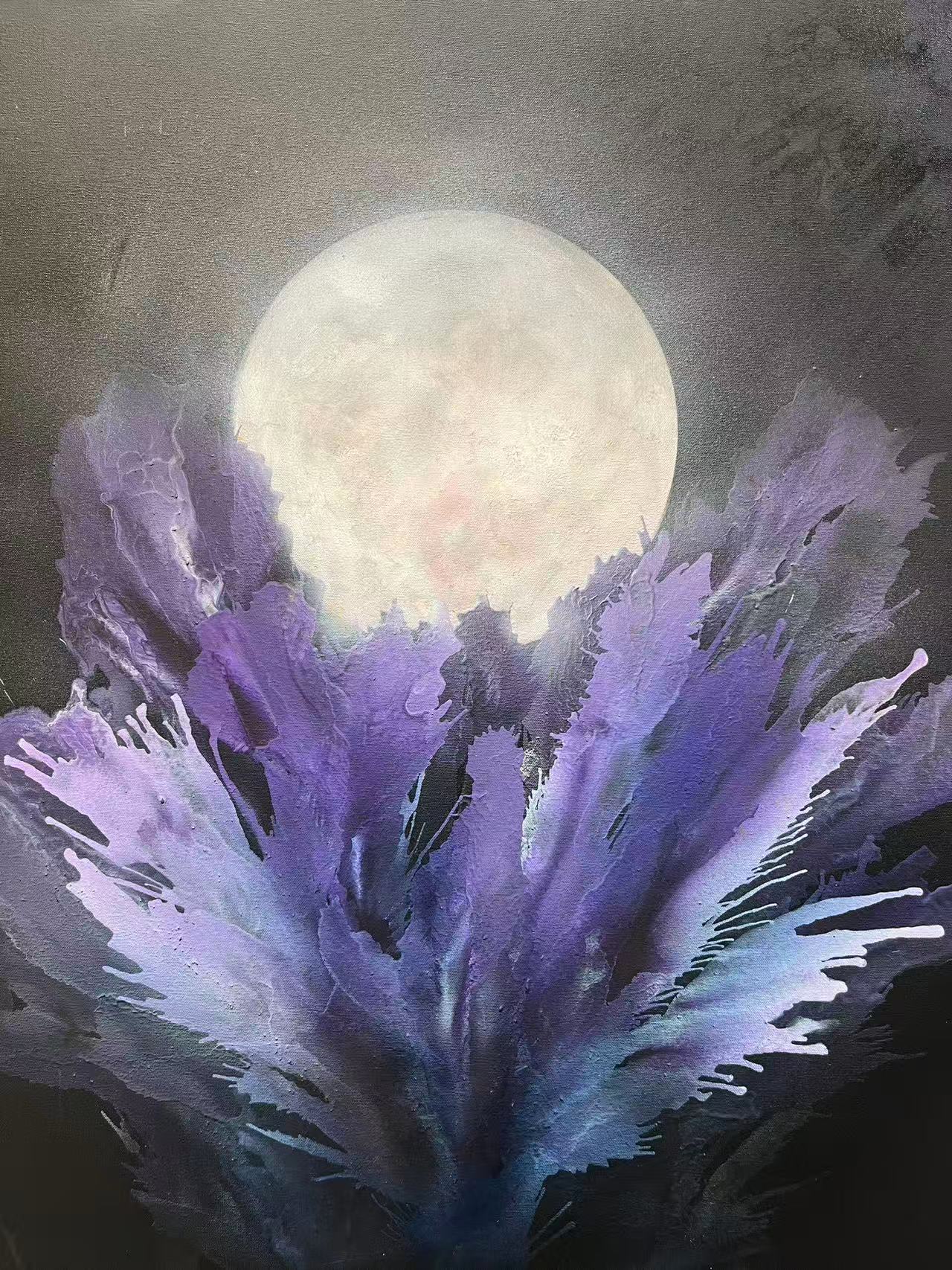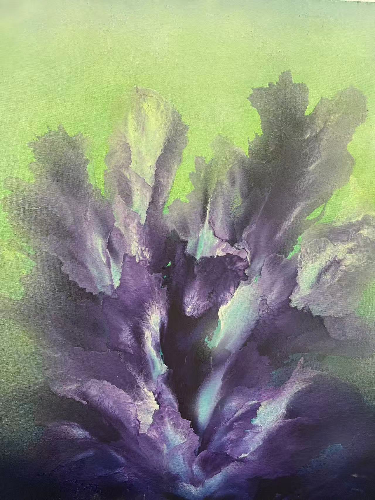 在油画创作中,她则以“色彩的碰撞”与“笔触的律动”展现生命的力量。前文提及的花卉抽象油画,便是典型代表。画面中,紫色并非单一的色调,而是从深紫到浅紫,层层晕染,如同生命在不同阶段的状态——深紫是生命的沉淀与思考,浅紫是生命的灵动与希望;黄色则以明亮的色块穿插其中,像是生命中的“光”,打破了紫色的沉静,带来蓬勃的活力。笔触方面,她采用“厚涂”与“晕染”相结合的方式:厚涂的色彩形成强烈的肌理感,传递出生命的“力量感”;晕染的色彩则柔和自然,表现出生命的“包容性”。没有明确的轮廓,没有具象的形态,却让观者能清晰感受到“生命在绽放”的律动——那是一种不受束缚、肆意生长的力量,是生命最本真的状态。