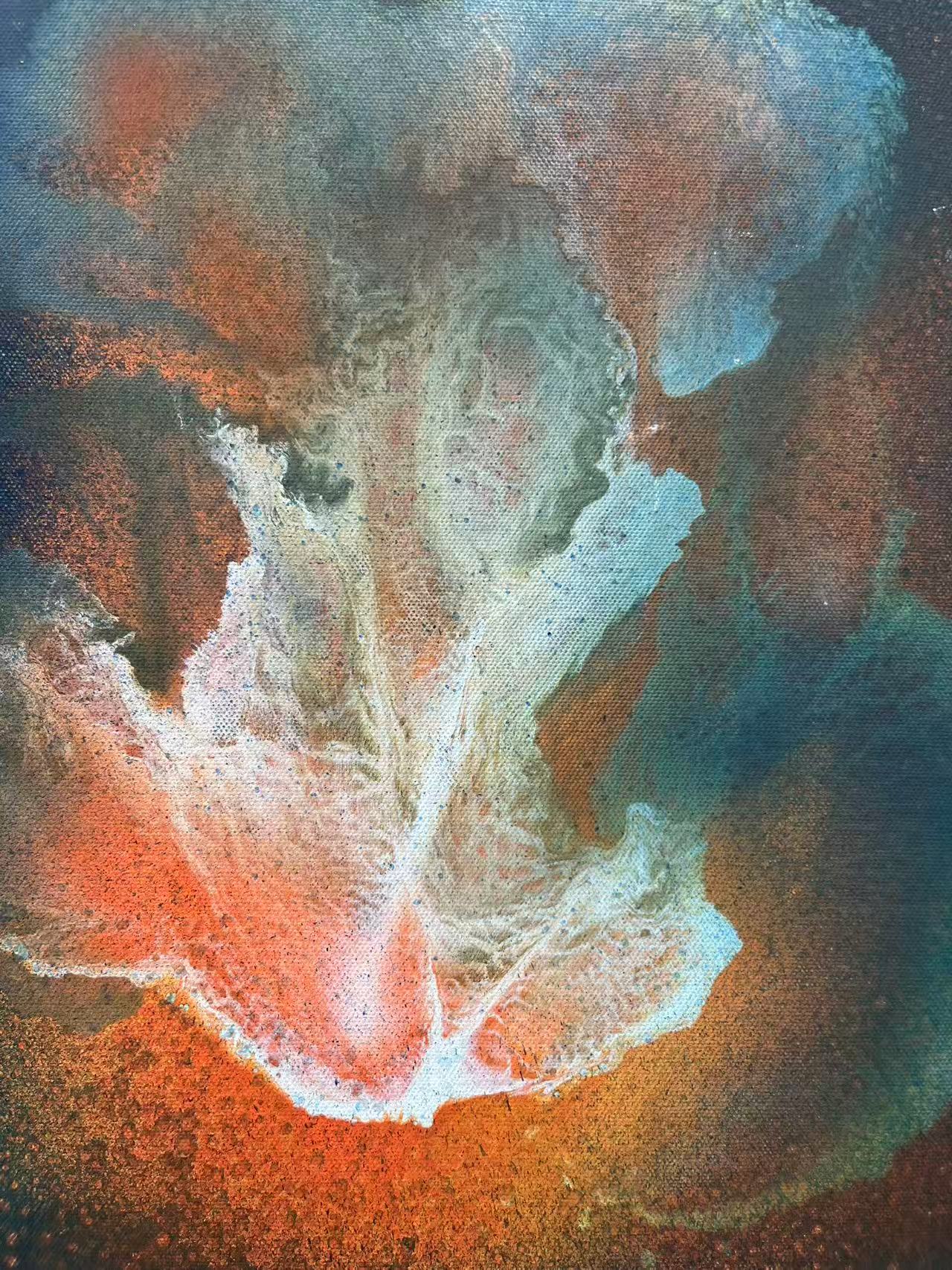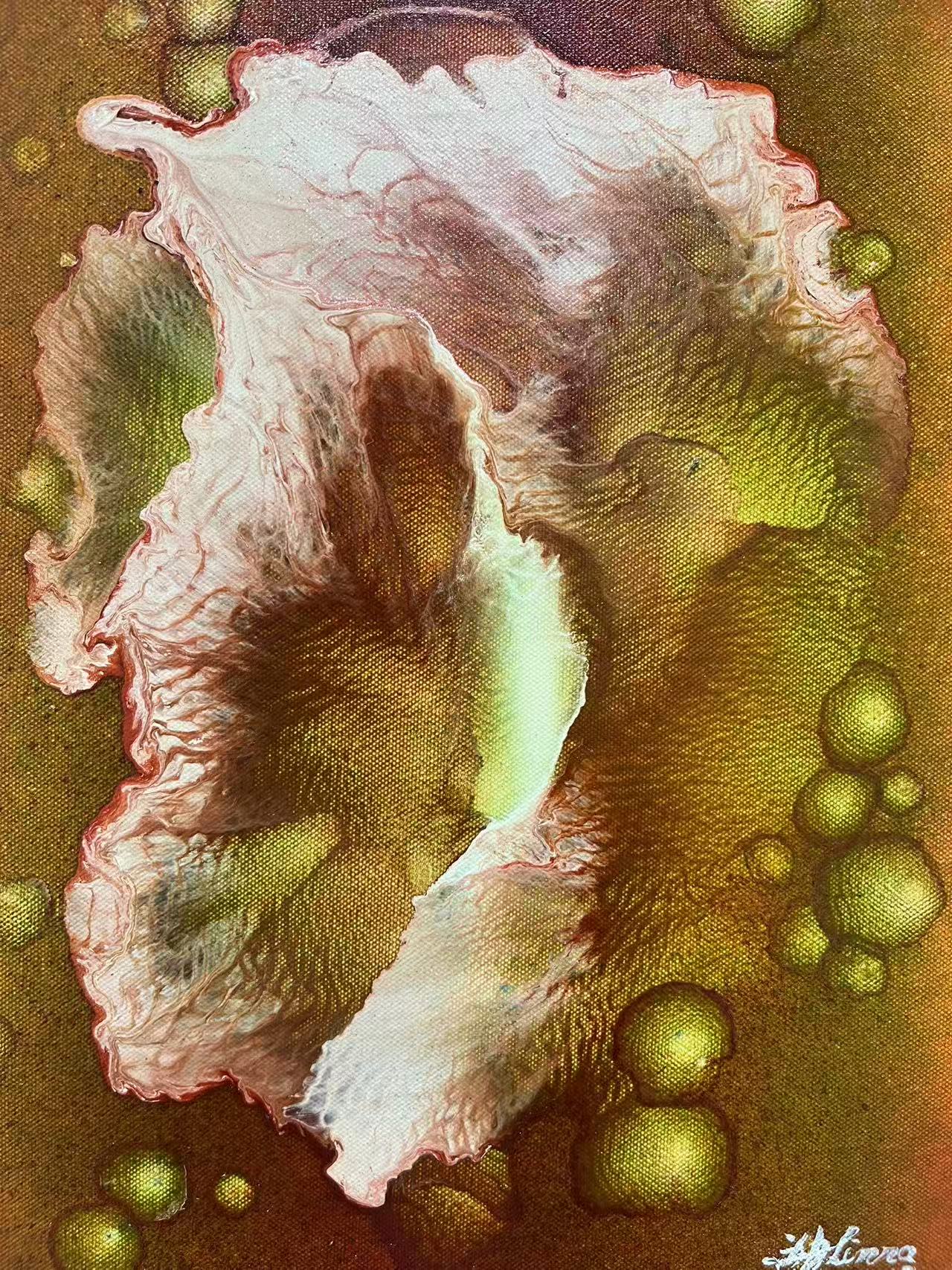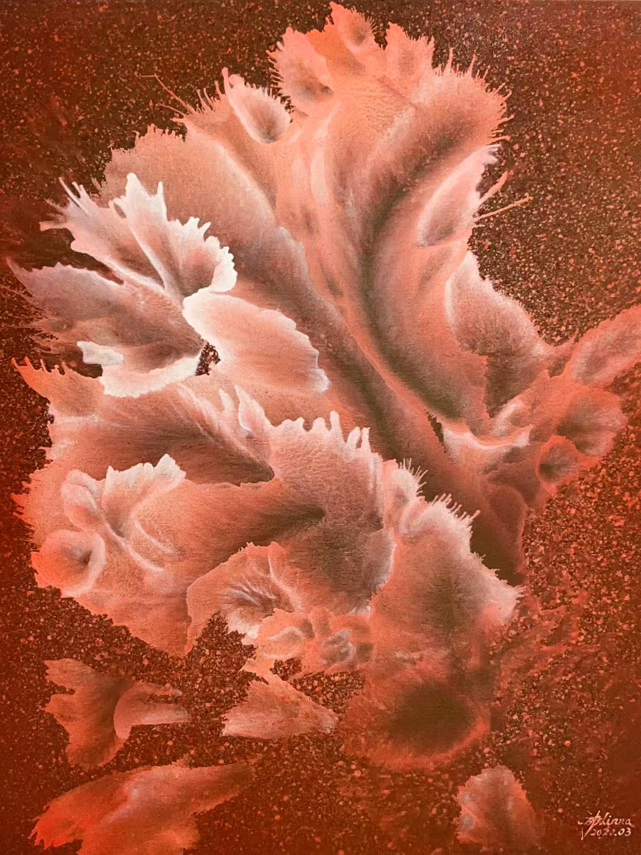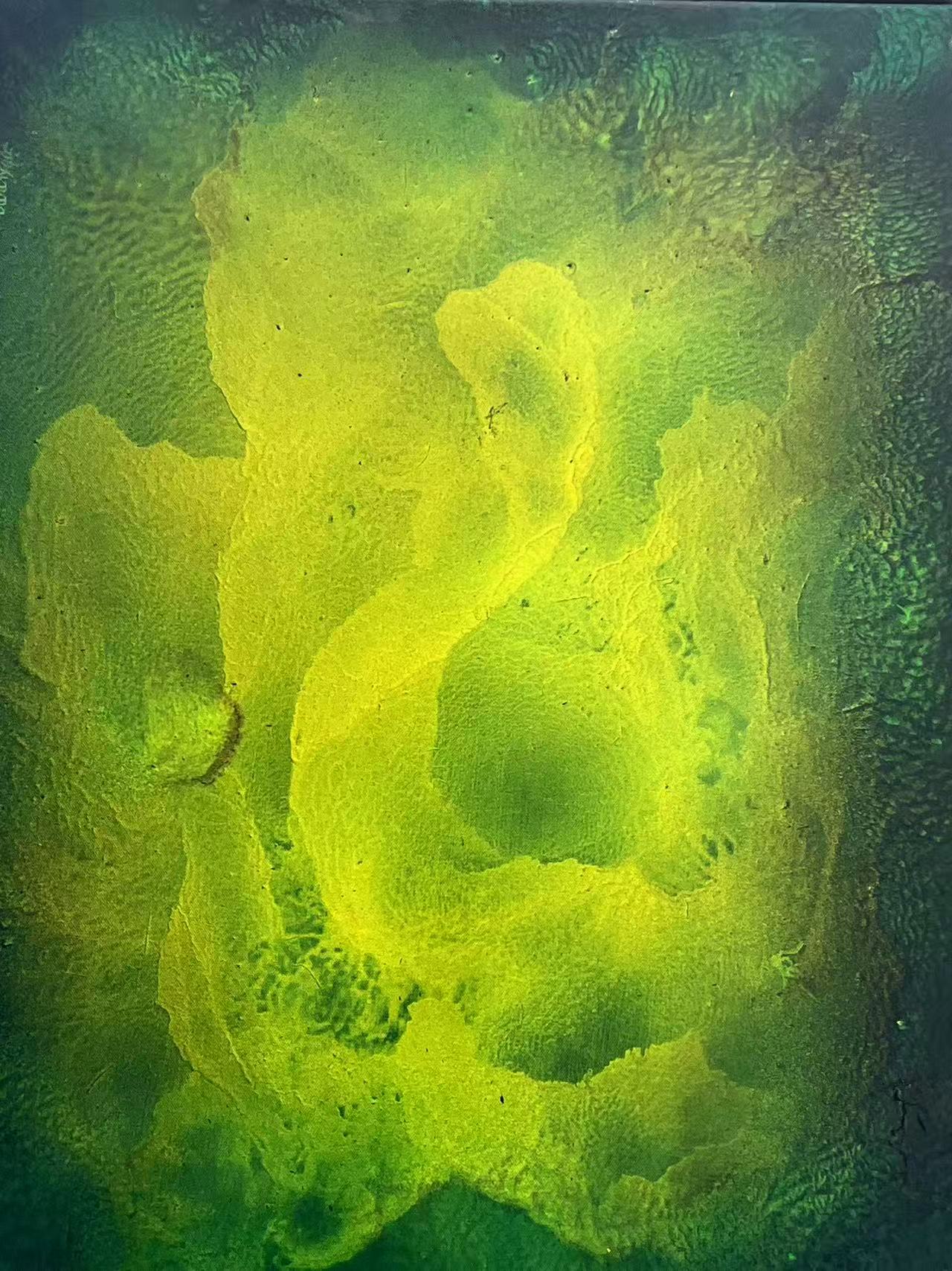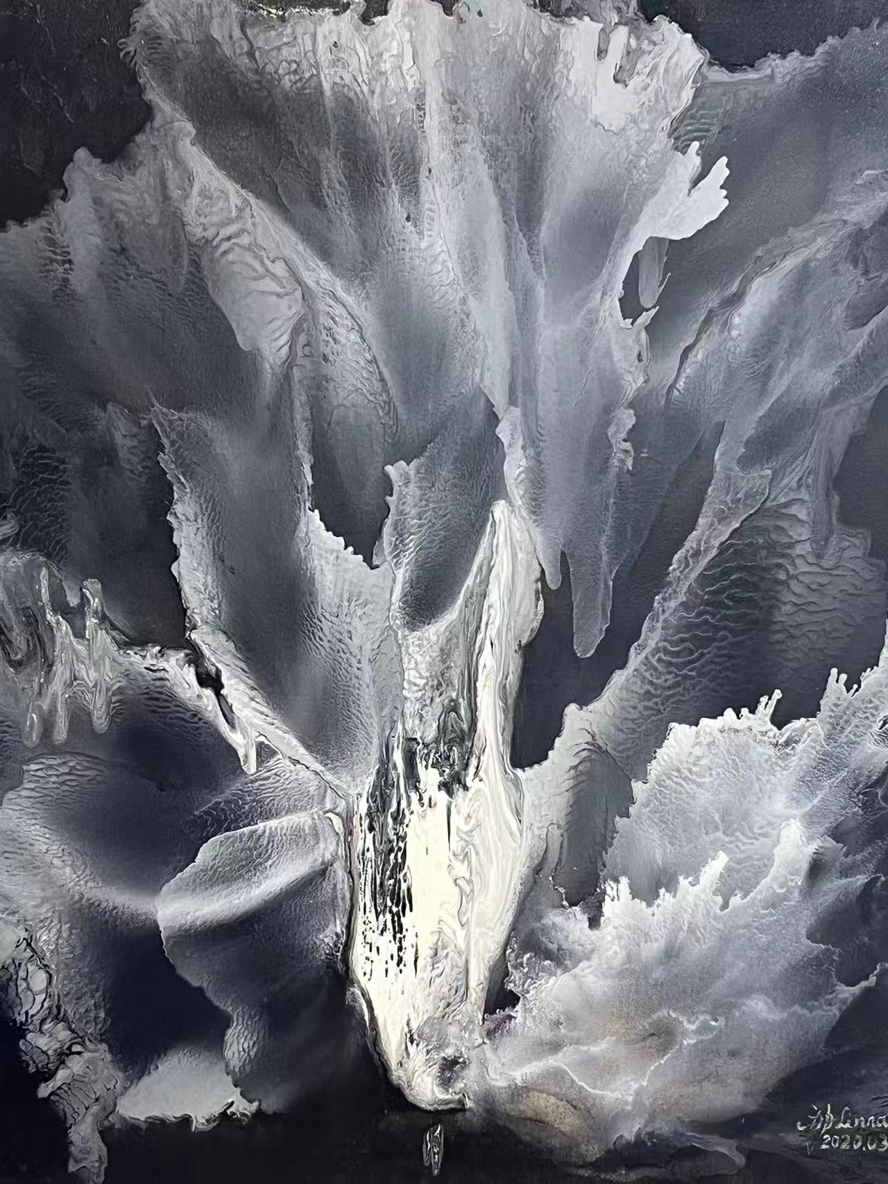 在油画创作中,她则以“色彩的碰撞”与“笔触的律动”展现生命的力量。前文提及的花卉抽象油画,便是典型代表。画面中,紫色并非单一的色调,而是从深紫到浅紫,层层晕染,如同生命在不同阶段的状态——深紫是生命的沉淀与思考,浅紫是生命的灵动与希望;黄色则以明亮的色块穿插其中,像是生命中的“光”,打破了紫色的沉静,带来蓬勃的活力。笔触方面,她采用“厚涂”与“晕染”相结合的方式:厚涂的色彩形成强烈的肌理感,传递出生命的“力量感”;晕染的色彩则柔和自然,表现出生命的“包容性”。没有明确的轮廓,没有具象的形态,却让观者能清晰感受到“生命在绽放”的律动——那是一种不受束缚、肆意生长的力量,是生命最本真的状态。