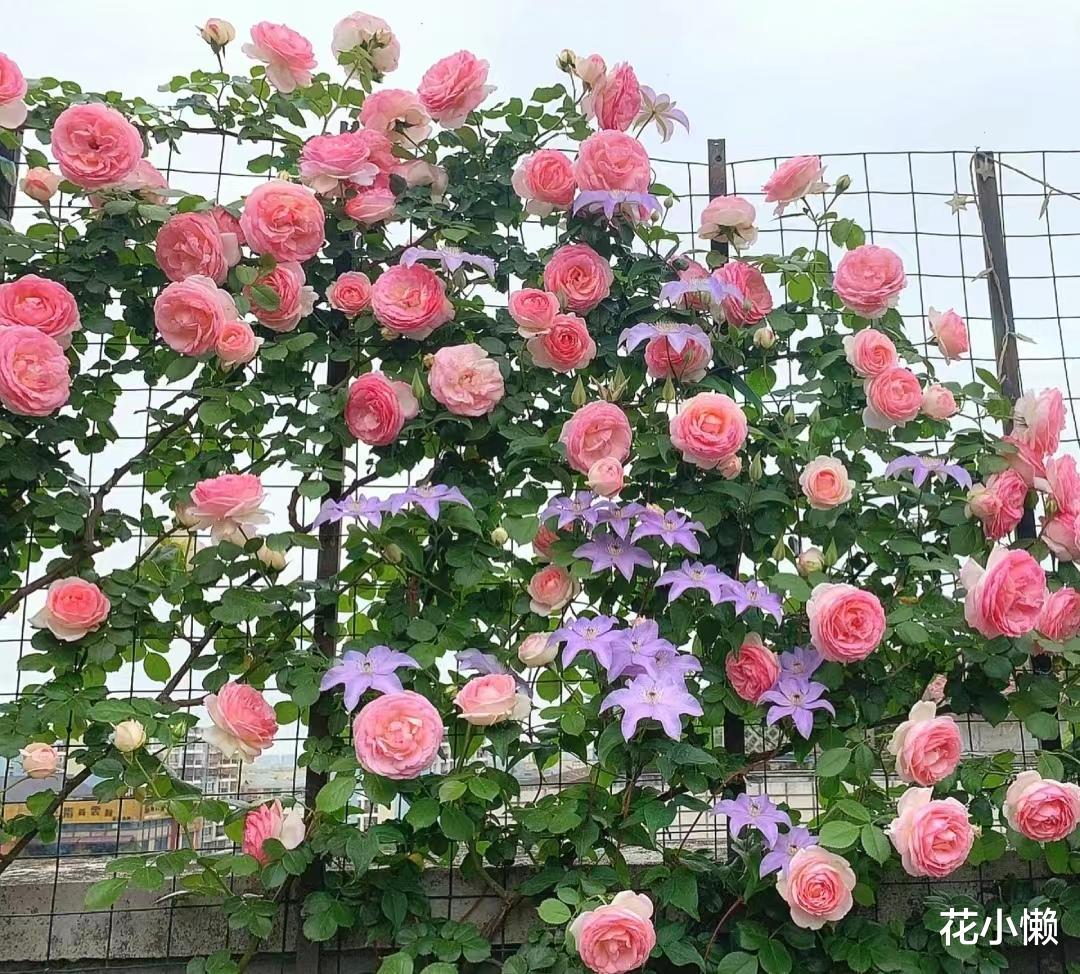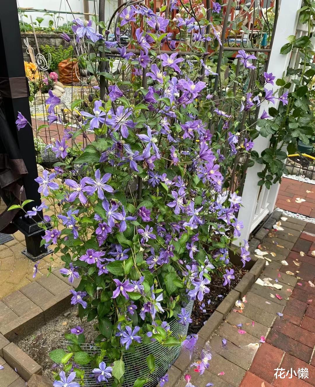 经常看着别人的铁线莲瀑布,内心羡慕嫉妒,铁线莲花墙大概是每个花友都想拥有的吧,而且铁线莲和月季真的就是天生组合,它俩搭配一起会让整个院子色彩上升了一个层次,铁线莲大多以蓝紫色系和白色等冷色调为主,而月季呢又多以红、粉、橘黄等暖色调为主正好互相弥补了对方颜色上的空白点,强强结合就是小院不可缺少的调色板。
