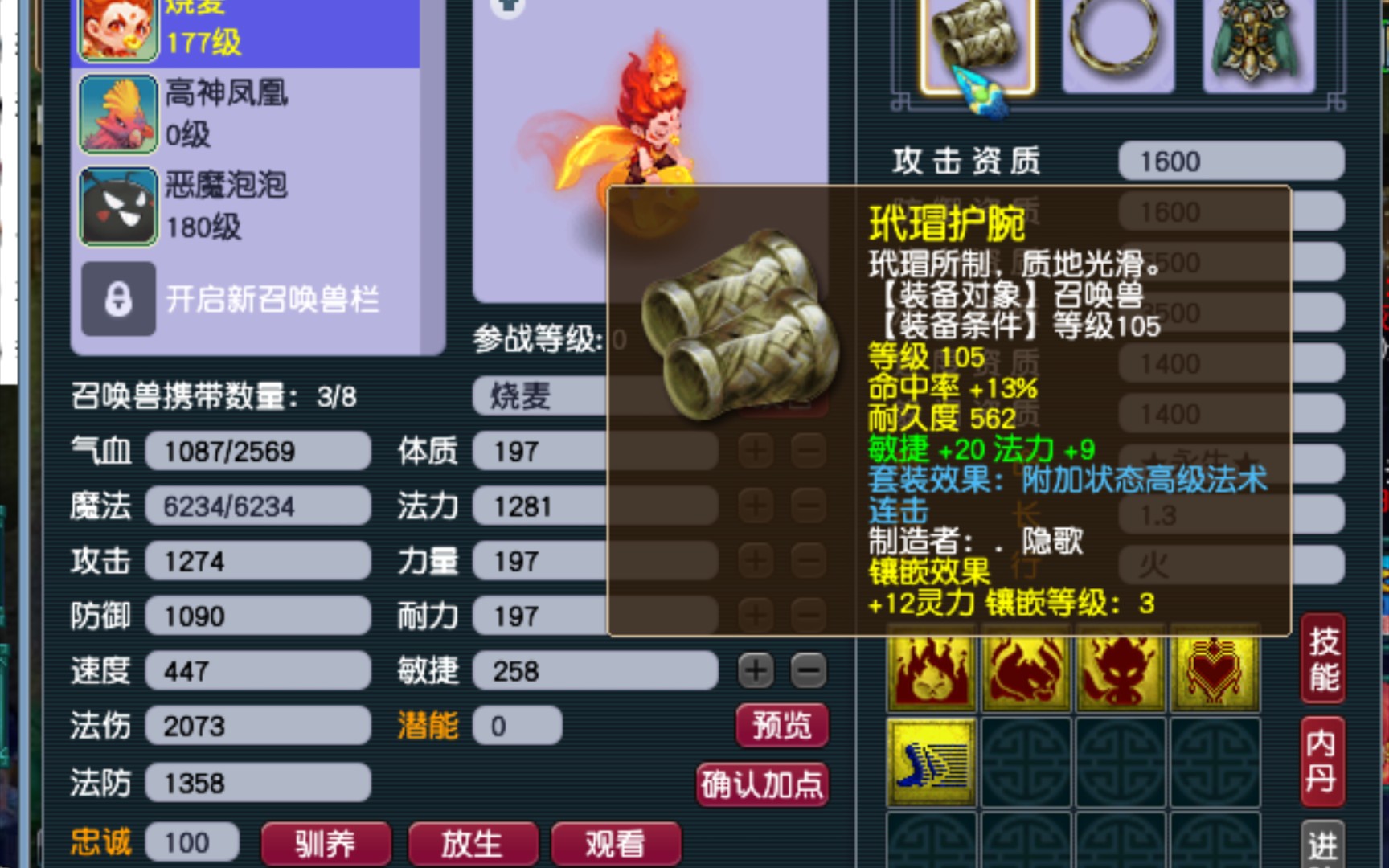 那这样看的话,如果打出一个完美的精通宝宝,应该是高级法术波动,高级法术连击,高级法术暴击,高级魔之心,须弥真言加两个单法技能,等于是一个7红的须弥,加上特性和更多的内丹,还有赐福技能。我觉得和红孩儿一较高下还是有很大的可能,虽然说红孩儿最强的优势在于它的输出公式计算基础的部分就很高,也就是说可以完全不加魔力,也能打出很好的伤害,但感觉这个精通单法也不差。但话说回来,如果没有这个书,这个精通技能必须通过合成来获得,那就等于一个双特殊的宝宝,这个制作成本就提升的多,恐怕就不行了。