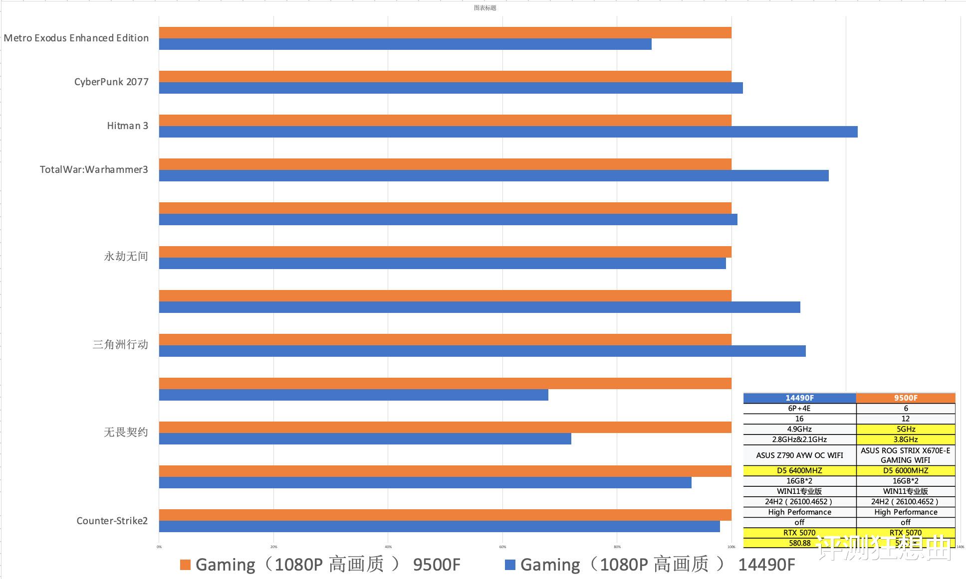根据网上大佬的实际游戏评测数据,在多款游戏表现中,两款CPU的表现各有优劣。具体来看,14490F在《三角洲行动》中展现出更强的性能,其平均帧数和1%Low帧都比9500F高出约12%。然而,在《无畏契约》中,9500F的优势更为明显,其平均帧数和1%最低帧数都比14490F高出约28%。而在《反恐精英2》和《永劫无间》这两款游戏中,两款CPU的性能差异非常小,差距都在3%以内,基本可以认为是旗鼓相当,用户可以根据自己常玩的游戏类型来做出选择。