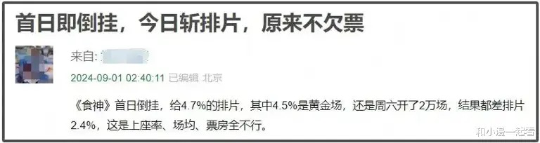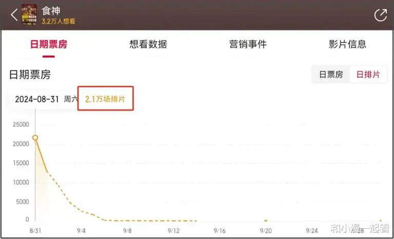 8月下旬,周星驰1996年自编自导自演的喜剧片《食神》在内地重映。作为星爷的代表作之一,片方给予了2.1万场、占比4.7%的超高排片,可谓重磅出击。然而,首日票房仅为同档期重映老片《孤注一掷》的两倍,与超高排片形成鲜明对比,令业内震惊。