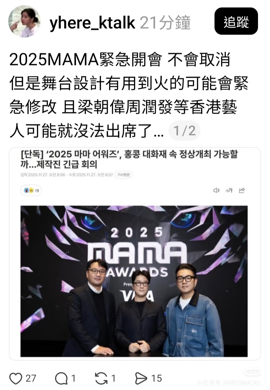 在这一突发变故中,演艺界人士也纷纷作出抉择。周润发和杨紫琼作为首批确认缺席的重量级艺人,迅速通过团队宣布退出MAMA颁奖礼。与此同时,内地顶流花旦杨幂通过工作室微博宣布“生命安全高于一切,暂缓官宣事宜”,而佘诗曼、容祖儿等香港本地艺人也取消了原定参加的各项活动。与此形成鲜明对比的是,多数K-POP艺人如IVE、Stray Kids、ZEROBASEONE等仍按原计划抵达香港并投入彩排,展现出全球娱乐工业的强大惯性。