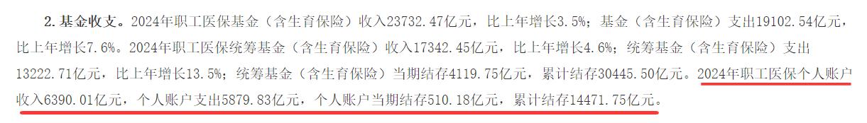 根据国家医保局的数据,截至2024年底,职工医保参保37948.34万人,职工医保个人账户累计结存14471.75亿元。也就是说这1.45万亿资金放在这里完全动不了,发挥不了作用,太浪费了。