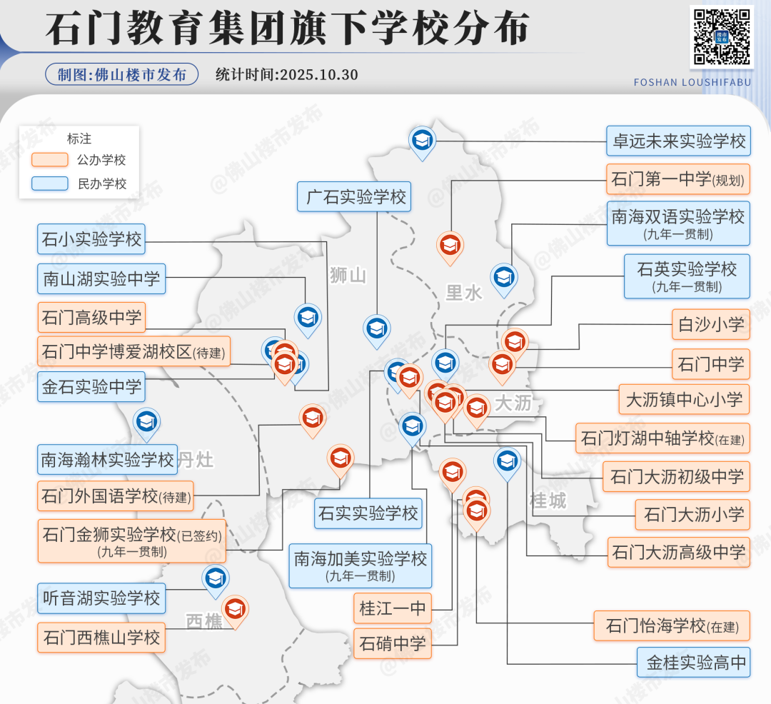 这所有着近百年历史的佛山名校,它的教育版图也在不断扩张。在集团化办学的趋势下,2000年石门教育集团成立,其以石门中学为核心 ,成员校涵盖小学、初中和高中各学龄段,公、民性质参半。据楼市君不完全统计,截至目前石门教育集团旗下学校至少有28个,布局覆盖南海大沥、桂城、狮山、西樵等镇街。