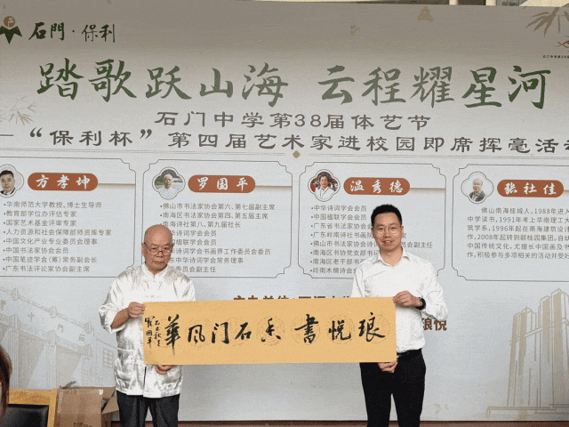 |石门中学校史馆|佛山楼市发布摄从1932年到现在,石门中学共有51464位杰出校友,在全国各个领域发光发热。值得一提的是,今天校园内还举行了“保利杯”第四届艺术家进校园即挥毫活动,业内知名书法家为保利天瓒、保利琅悦两个项目题词,保利华南南海项目部常务副总经理陈光泽、保利天瓒项目营销经理何凯杰作为代表接过题字。