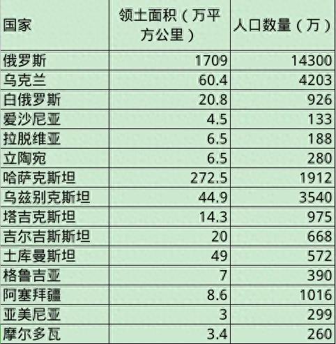 苏联解体后,共分出了15个主权国家,分别是:东斯拉夫三国的俄罗斯、乌克兰、白俄罗斯;波罗的海三国的爱沙尼亚、拉脱维亚、立陶宛;中亚五国的哈萨克斯坦、乌兹别克斯坦、塔吉克斯坦、吉尔吉斯斯坦、土库曼斯坦;外高加索三国的格鲁吉亚、阿塞拜疆、亚美尼亚;以及摩尔多瓦。