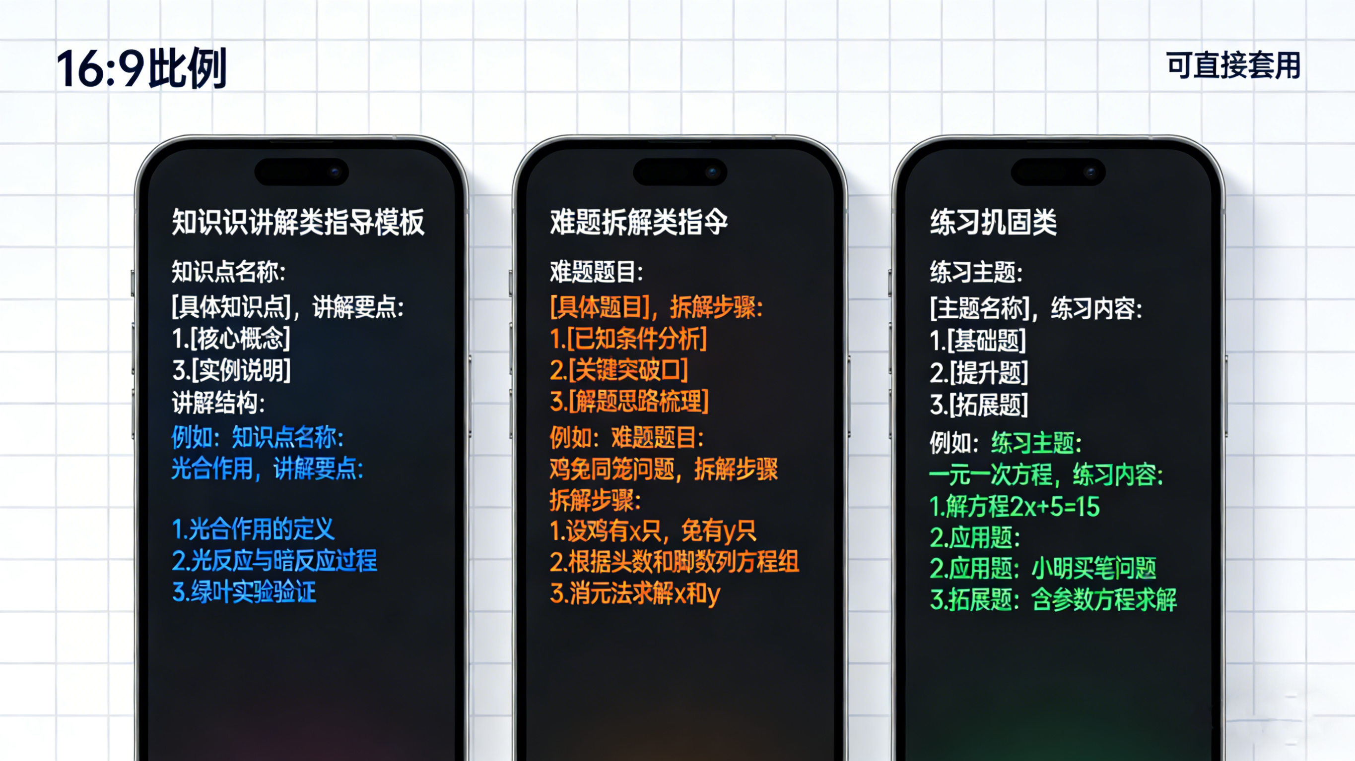 很多人用AI效果差,根源是指令太模糊,比如只说“讲解这个知识点”“帮我做这道题”。好的指令要包含“受众定位+核心需求+输出要求”三个关键要素,下面这3个万能模板,能适配80%的学习场景,直接替换括号里的内容即可使用: