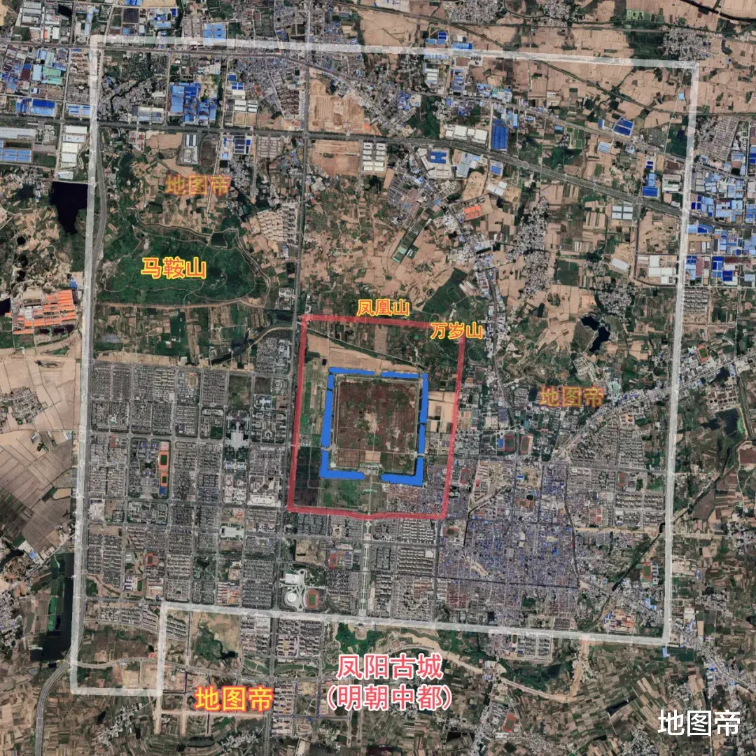 明中都由外城(相当于明清北京城)、中城(禁垣,相当于北京皇城)、皇城(相当于北京宫城)三部分组成,城南为圜丘(天坛)和皇陵,城北为方丘(地坛)。