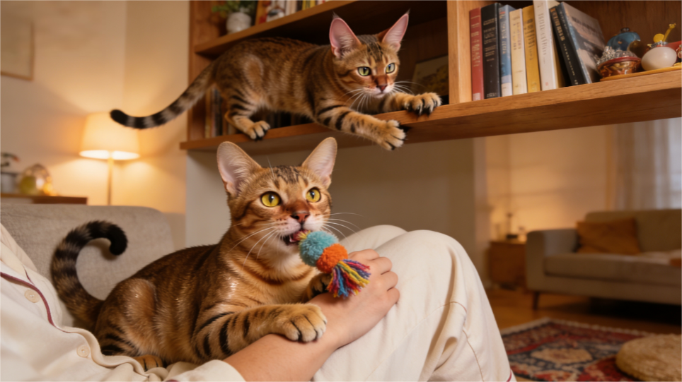 堪称 “猫中黏人精”,对主人有极强的依恋欲,喜欢趴在主人膝头、肩头甚至电脑键盘上,主人移动时会紧随其后,被称为 “影子猫”。互动需求极高,能主动发起游戏,如叼玩具到主人面前求玩耍,甚至学会开门找主人,每日需 20-30 分钟互动才能满足。
