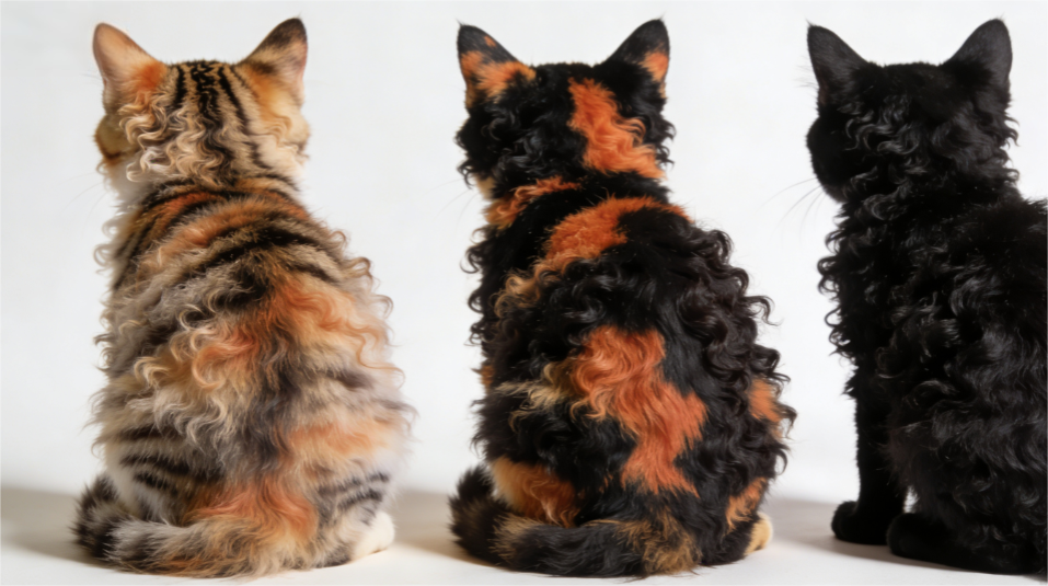 毛色涵盖所有猫类色系,其中虎斑卷毛、玳瑁卷毛和纯色卷毛最为常见:虎斑卷毛的斑纹因卷曲毛发呈现 “模糊渐变感”;玳瑁卷毛的黑橙色块交错自然;纯色卷毛(如黑色、白色、奶油色)则更凸显毛发的卷曲纹理。国际标准要求被毛无秃斑,卷曲分布均匀,光泽度需达到 “光照下显层次感” 的标准。