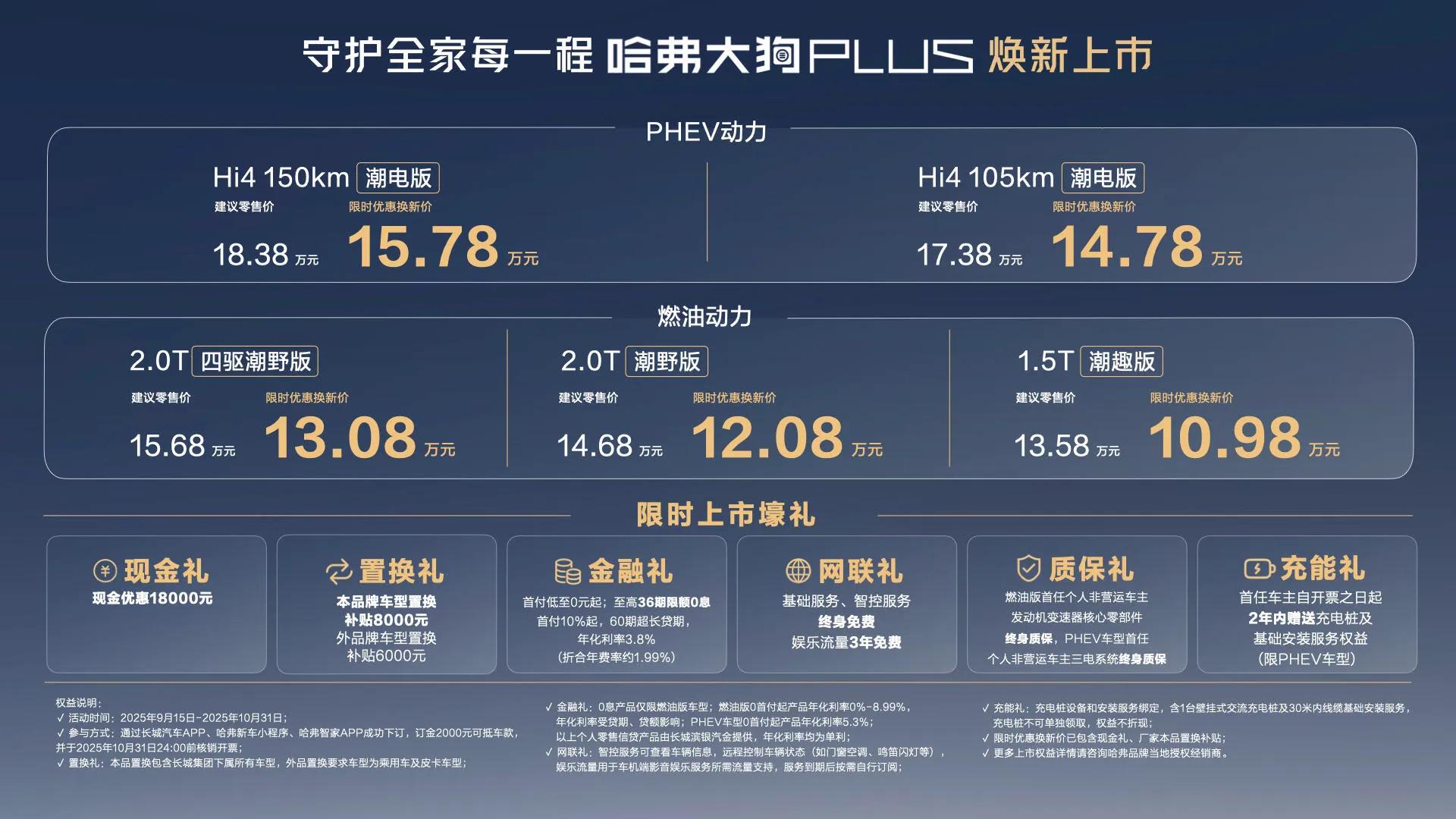 9月15日,哈弗大狗PLUS正式上市,官方售价13.58—18.38万元,但限时焕新价直接把起步价拉到了10.98万元。这价格一出,很多人第一反应是:哈弗又在“卷”了。
