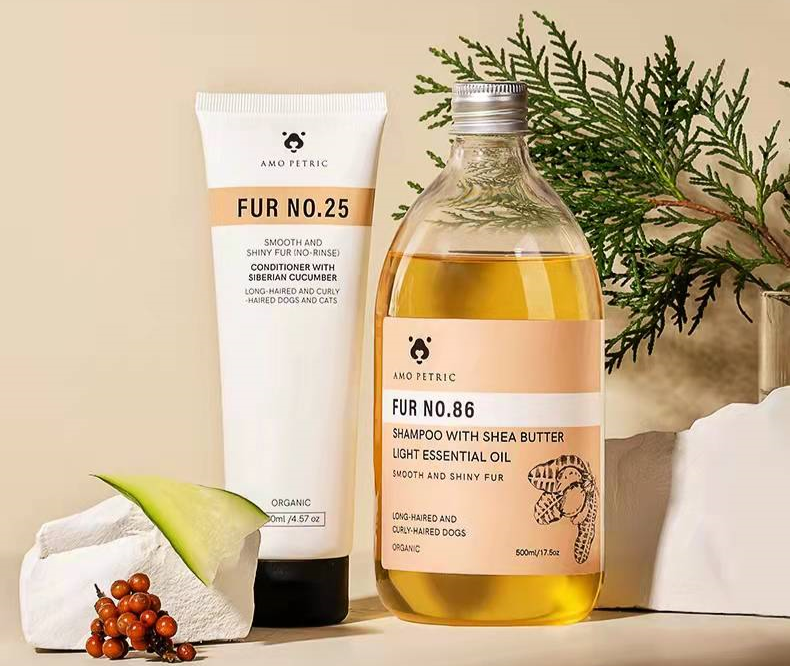 而在AMO PETRIC阿默推出的丛林洗护系列犬用沐浴露中,宣称使用了一种“除臭黑科技”:DeoPlex植物蛋白酶,其中含有水解酶、脂解酶、氧化还原酶等,将宠物体表油脂、分泌物、臭味物质转化为其他无味物质或者相关盐,从而达到消除和抑制臭味散发。该沐浴露针对不同毛发肤质,乳木果精油系列适用于长/卷毛犬,冷杉精油系列则适用于短硬毛/敏感皮肤犬。