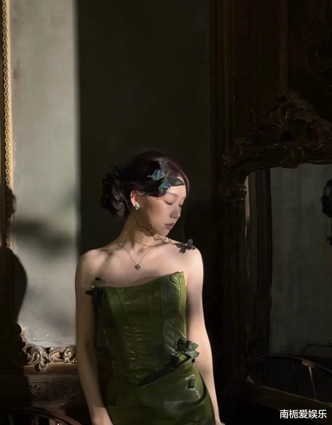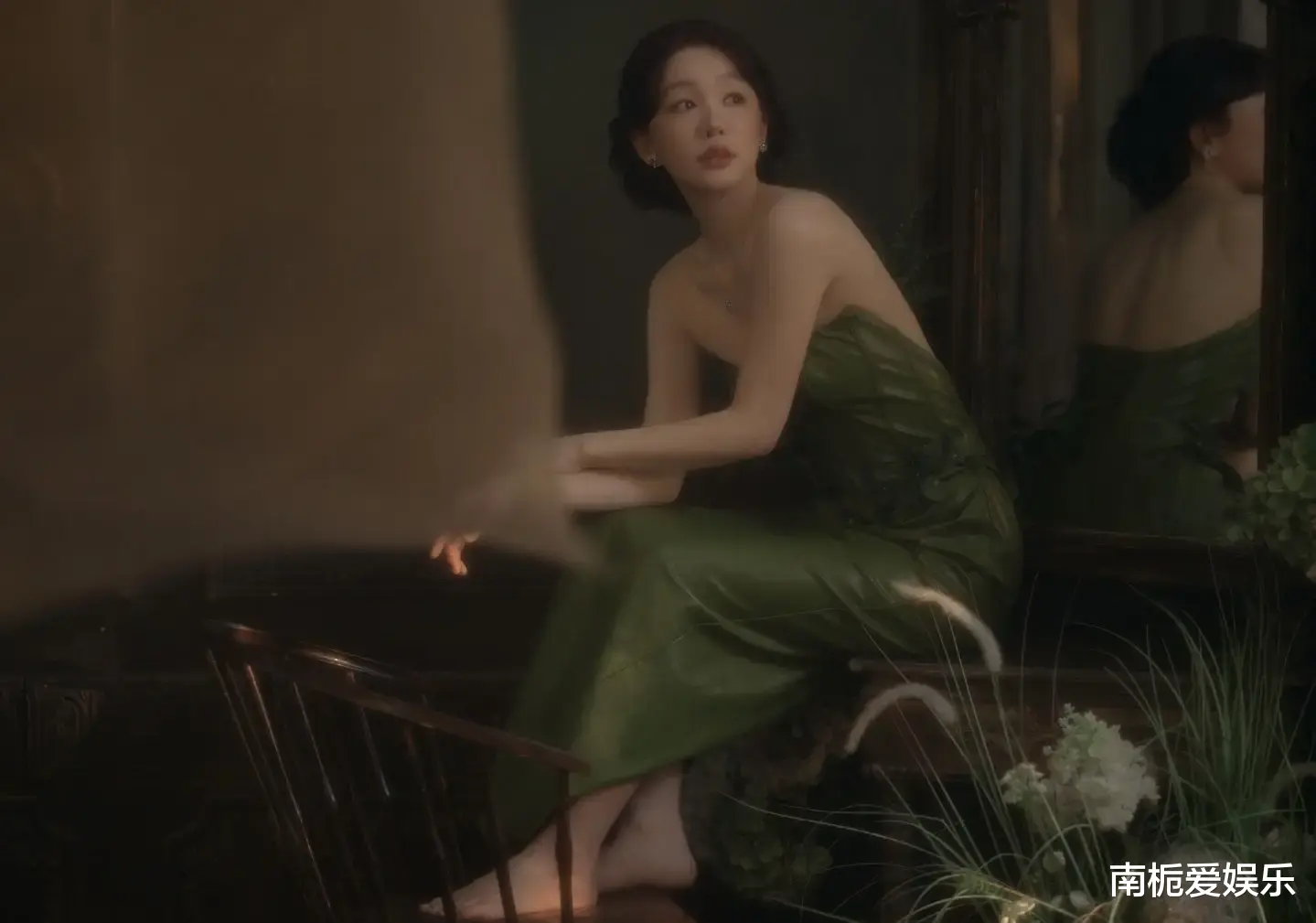 整套造型的细节堪称匠心独运。低饱和度的妆容摒弃浓艳,着重突出眉眼神韵,眼尾细微的晕染处理融合了破碎感与坚韧感,在光影交错间呈现出“画中人”般的艺术美感。镶钻绿色耳钉与裙装色调精准呼应,低调却不失奢华,成为点睛之笔。面纱随风轻扬,眼神或坚定或迷离,仿佛在讲述一段尘封已久的家族往事,赋予造型极强的叙事张力。