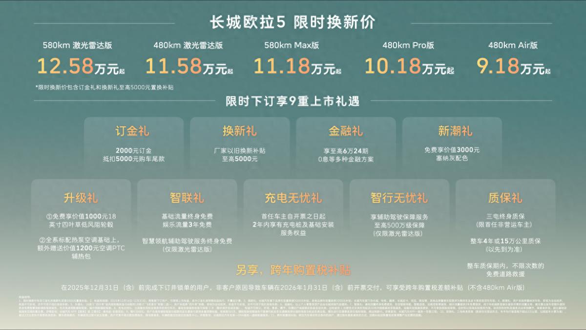 【中国·保定】2025年12月16日——今日,长城汽车欧拉品牌全新A级纯电SUV——长城欧拉5正式上市。新车共推出5款配置,建议零售价区间为 9.98万至13.38万元,限时换新价9.18万元起(限时换新价包含“订金礼”和“换新礼”至高5000元以旧换新补贴)。为回馈广大用户的热爱与支持,即日起至2025年12月31日,用户下订并锁单即可尊享包含订金礼、换新礼、智行无忧礼在内的9重上市好礼,以及跨年购置税补贴(不含480km Air版)等丰厚购车权益。凭借诚意十足的价格权益与越级产品力,长城欧拉5致力于成为全球年轻用户的“严选搭子”。