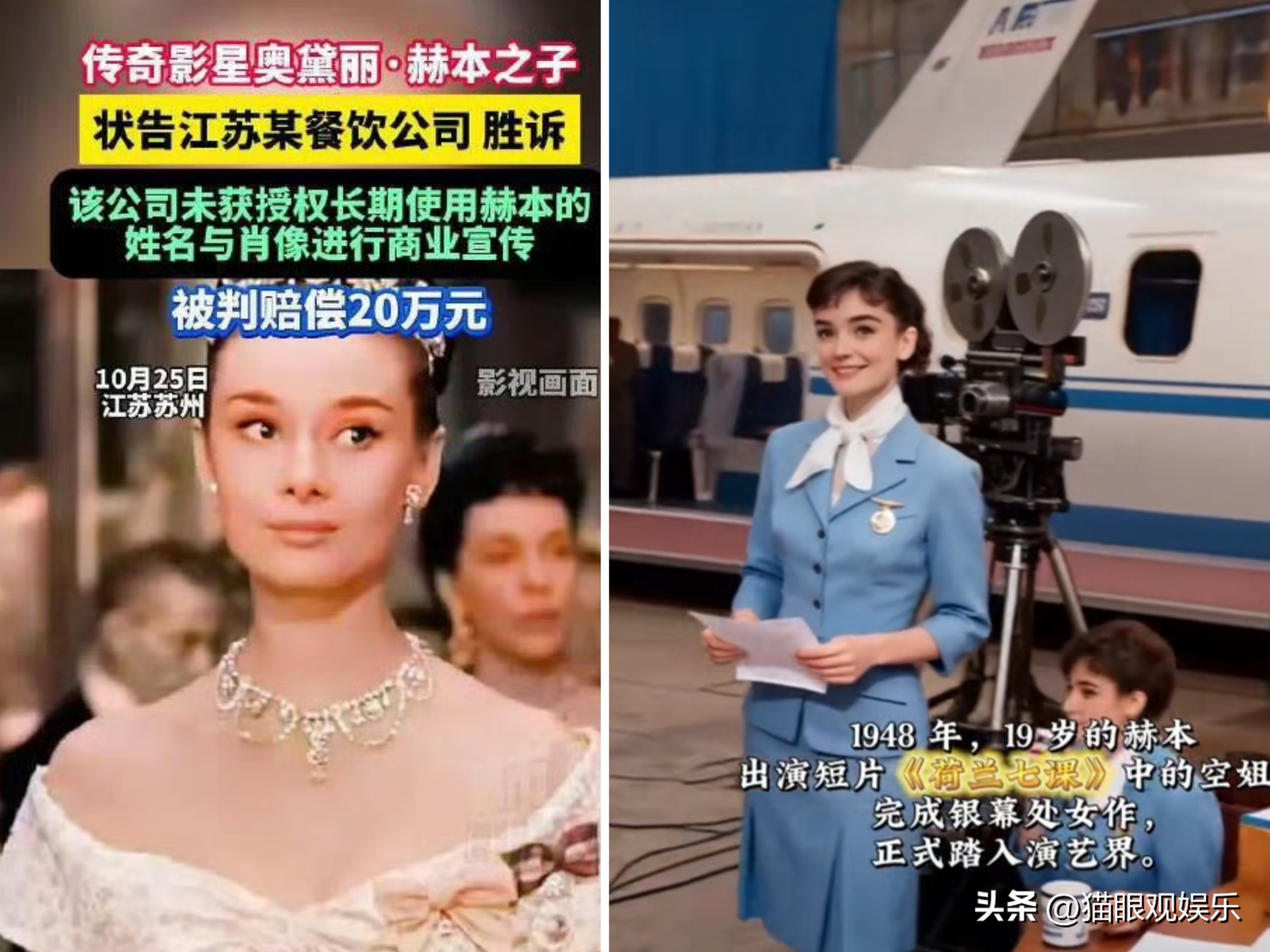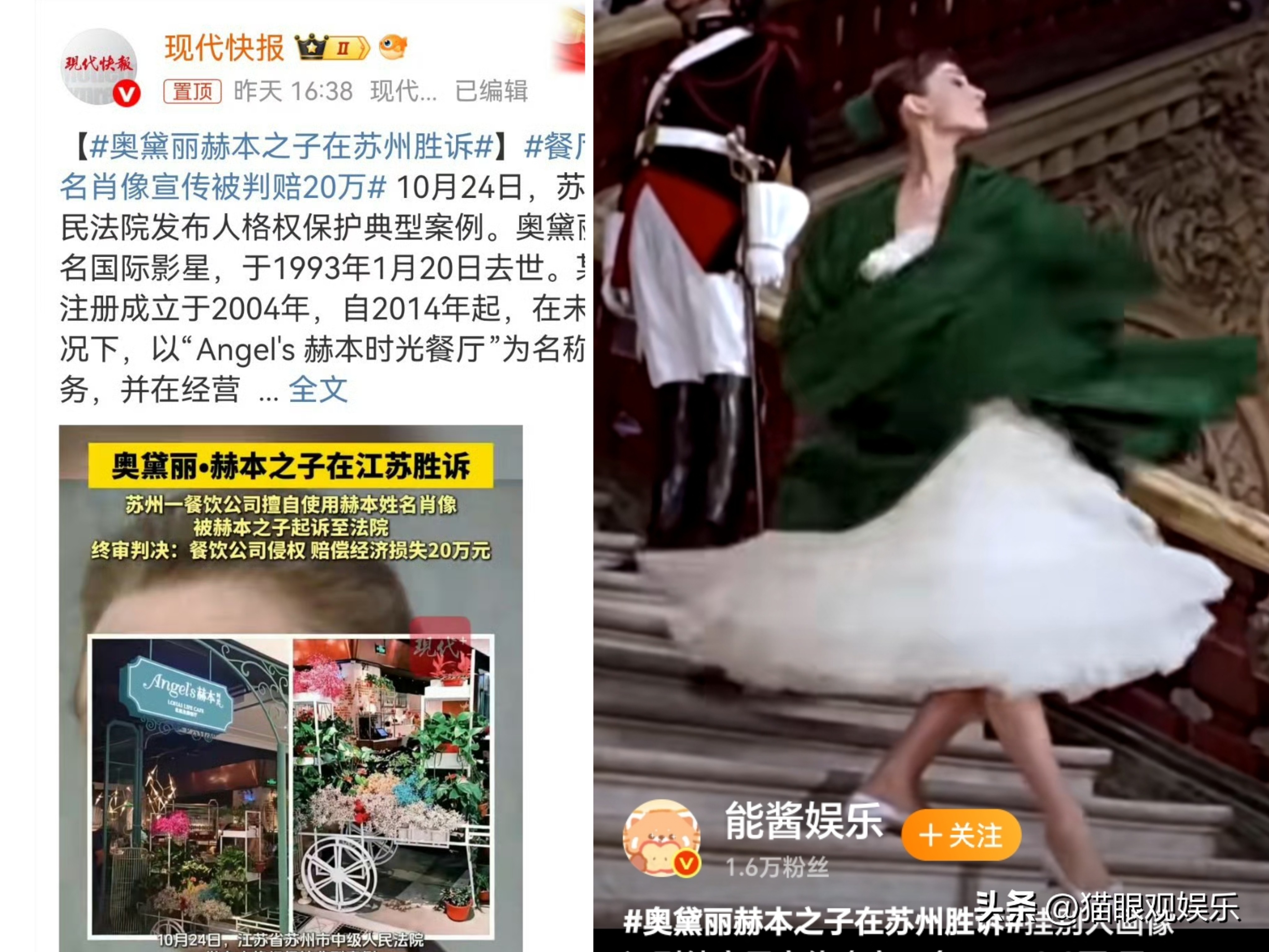 回溯2014年,江苏某餐饮公司便开始“搭便车”:未经任何授权,擅自以“Angel’s赫本时光餐厅”为招牌,将赫本的姓名、肖像铺满门店装潢、官网及微信公众号,借这位传奇影星的全球影响力招揽顾客,侵权行为持续十余年,毫无边界感。