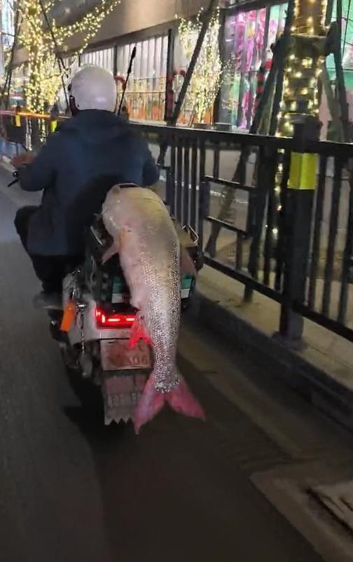 晚上7点半,符晨阳将鳡鱼固定在自己的电动车后座,开始了一场绕城骑行。街上的人看到他骑车带着一条巨大的鱼,都忍不住驻足观看、议论纷纷。这种被关注的感觉让符晨阳感到无比满足。