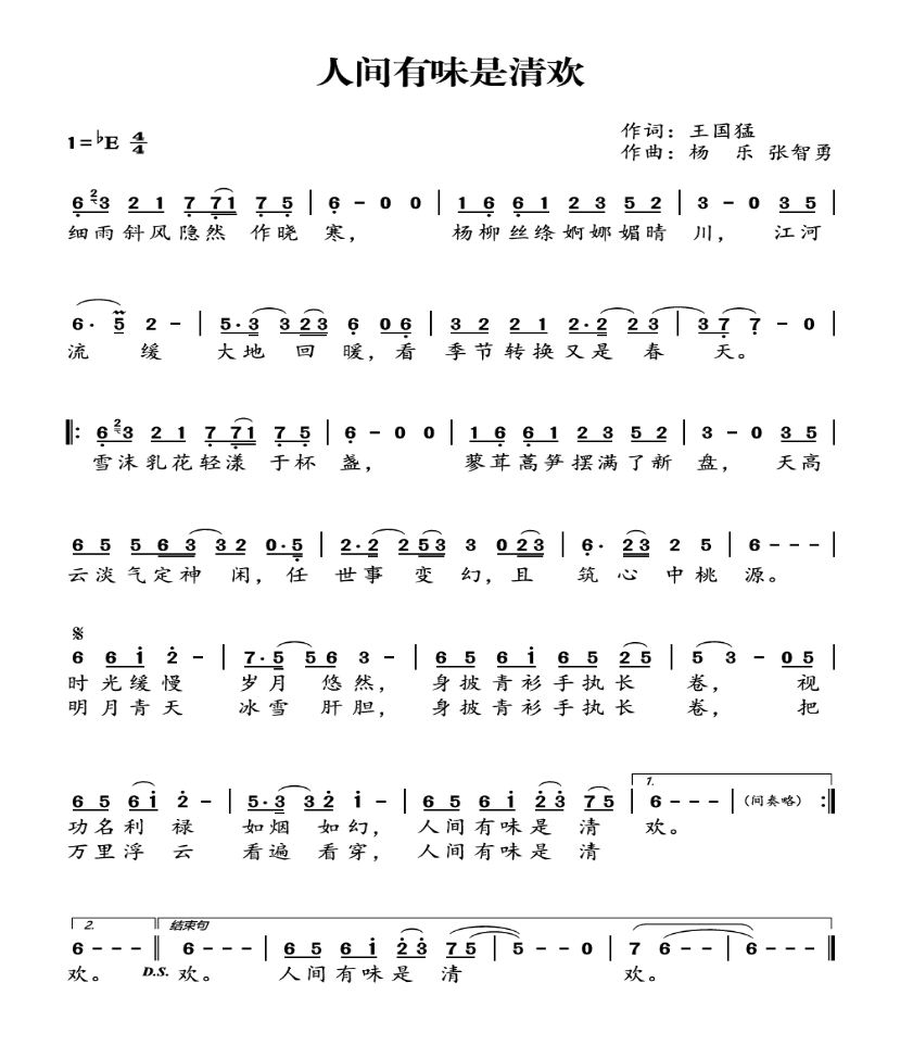 《人间有味是清欢》由知名歌手杨乐演唱,王国猛作词,杨乐与张智勇共同作曲。歌曲深入挖掘 “清欢” 这一内涵,歌词运用诗意笔触,生动描绘出当代人淡泊物质、向往简单生活的心境,有效唤起人们对纯粹与内心满足的向往。旋律创作上,巧妙融合中国古典音乐元素与现代流行音乐风格,当传统与现代激情碰撞,一幅跨越时空的听觉盛景就此编织而成,既有古典音乐的悠远意境,又充满现代流行音乐的活力。