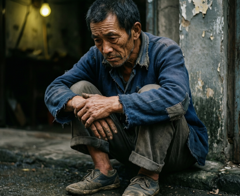 不是逢年过节视频里的模样,身上那件蓝布褂子洗得发灰,边角磨出了毛边,裤脚沾着点干硬的泥土,一看就是凌晨赶早班车从乡下过来的。