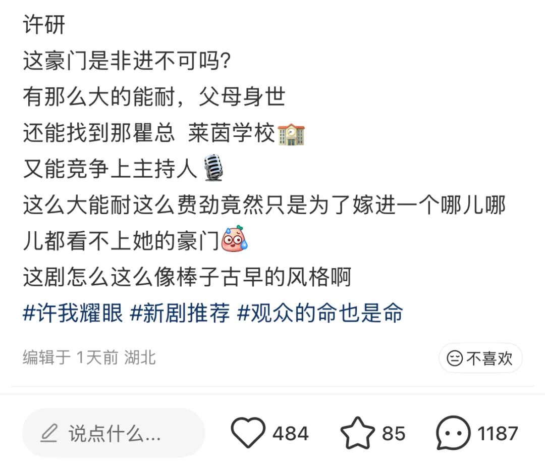 说到底,《许我耀眼》就是精准拿捏了观众的心理:用“女性觉醒”的旗号满足当代审美,用“霸总灰姑娘”的内核提供情绪价值。那些逻辑 bug、土味桥段,在“上头”的剧情节奏面前都成了次要矛盾。毕竟谁不想在下班回家后,看个女主靠点小聪明、再沾点霸总光就逆袭的故事呢?毕竟不带脑子看的快乐,才是短剧最实在的魅力。