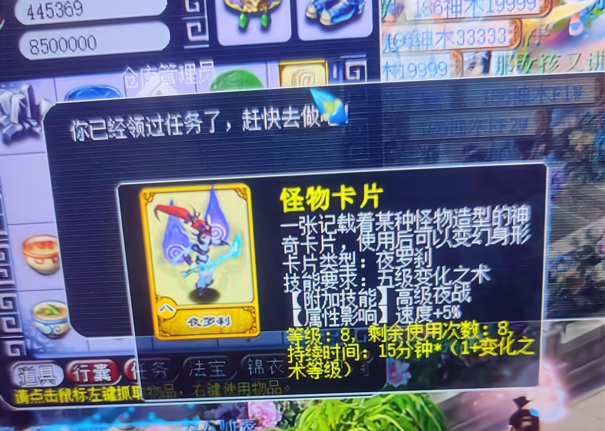 正常的玩家都不会选择完成普通类型的水陆大会副本任务,因为在水陆大会副本任务的正常奖励中并没有什么太过值钱的道具奖励,但是水陆大会副本任务的奖励上限却是非常高的,上面的这位玩家在水陆大会副本任务中获得了一张满次的夜罗刹卡片,这张卡片的价值已经达到了一千五百万左右的梦幻币了,不过,不是所有的玩家都能够获得这么好的东西,在水陆大会副本任务中获得满次夜罗刹卡片的几率比鉴定装备的时候出无级别都要低。