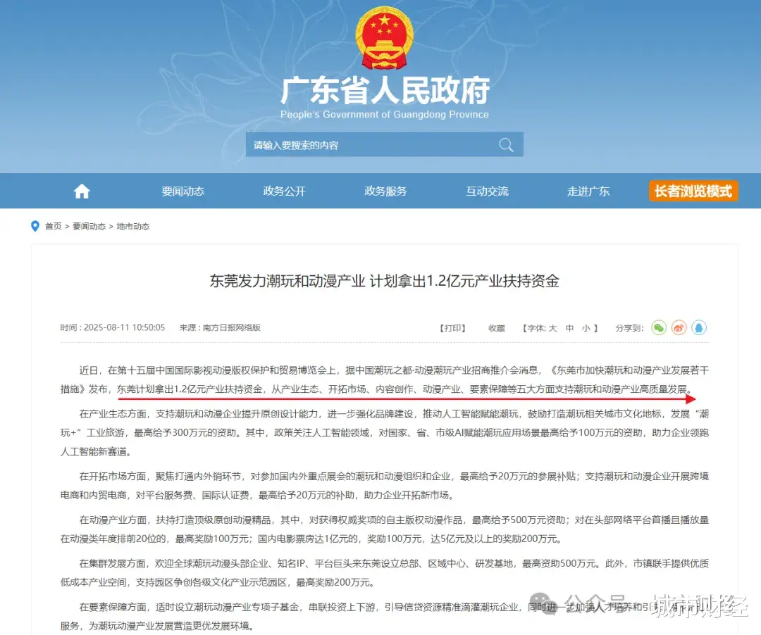 8月份,东莞市发布了《东莞市加快潮玩和动漫产业发展若干措施》,计划拿出1.2亿元产业扶持资金,从产业生态、开拓市场、内容创作、动漫产业、要素保障等五大方面支持潮玩和动漫产业高质量发展。