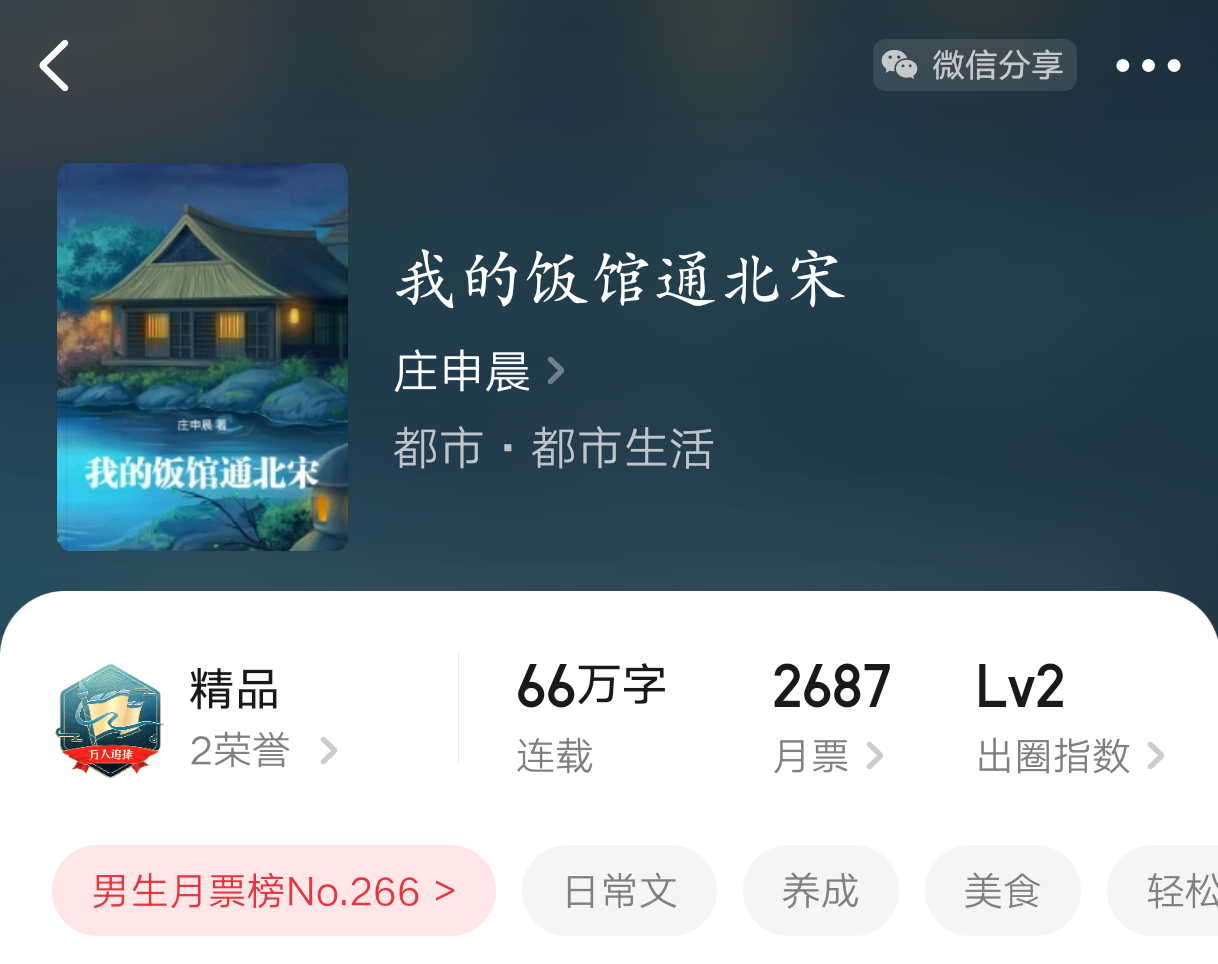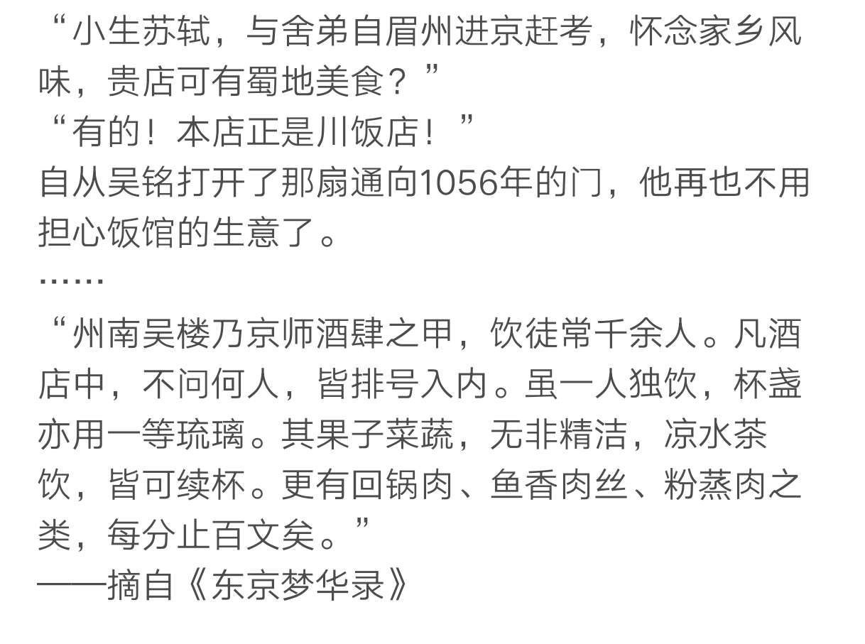 一个蛮有趣的故事,虽然主角的饭馆后厨能够直接通向北宋的京城,但是仅限他本人和美食可以来回穿越。