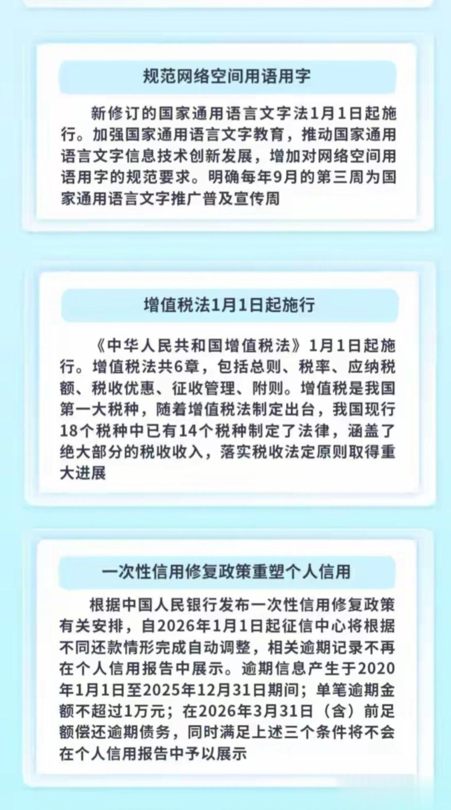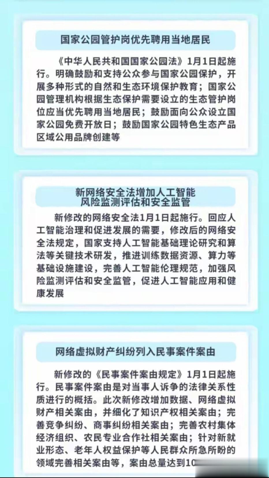 总结这一系列新规聚焦社会新问题(如AI、无人机)、加强民生保障(幼儿园收费、信用修复)、推动绿色转型(电动车能耗、国家公园)和完善市场经济基础制度(税收、公司治理),标志着法律与政策体系的一次重要年度更新。