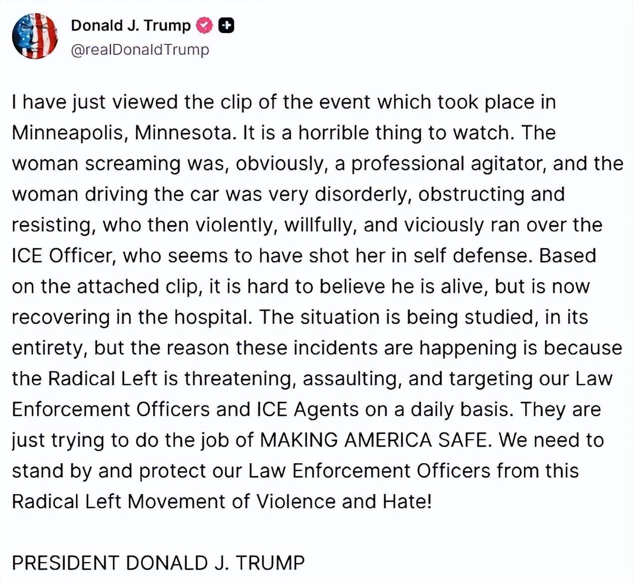 川普 在 Truth Social 上发文称,这名已故司机“行为非常不检点”,并且“恶意撞倒了移民执法局官员”。