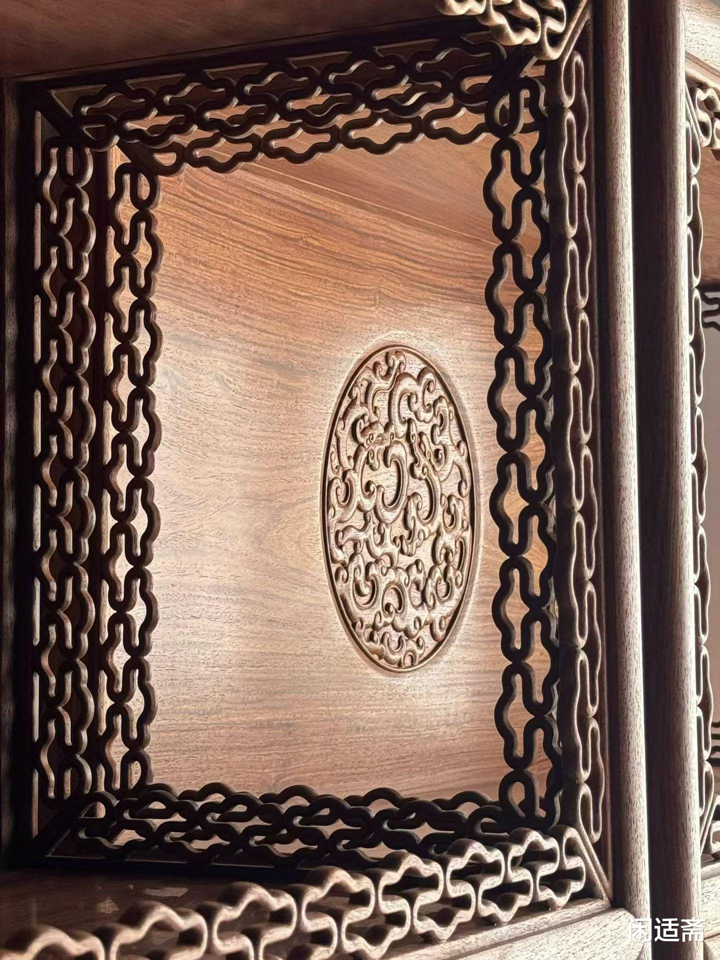 整器制作工艺考究,龙纹雕刻与结构设计尽显匠心。上部亮格部分采用三面敞开式设计,视野通透开阔,便于陈列雅瓷、古籍、文玩等藏品;亮格边缘设圈口,圈口处镂空雕刻祥云纹,纹样细腻流畅,如云气缭绕,寓意“吉祥如意”。亮格背部中间采用铲地浮雕工艺打造圆形开窗,窗内雕刻螭龙纹,螭龙盘绕,姿态灵动,栩栩如生,尽显雕刻功力。柜门采用对开式设计,上部镂空雕刻开窗螭龙纹,虚实相生;下部满雕铲地浮雕夔龙纹,纹样密集却不杂乱,尽显古龙威严雅致,龙纹作为传统吉祥纹饰,更赋予柜体“尊贵吉祥”的文化内涵。