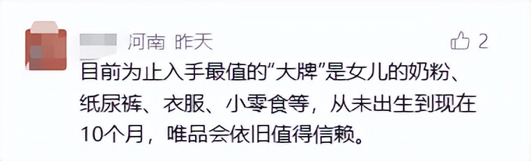 另外奢侈品之外,还有一批宝妈点赞了唯品会母婴产品。比如一位网友称,在唯品会买得最值的“大牌”是女儿的奶粉、纸尿裤、零食。称从女儿出生一直信赖唯品会。