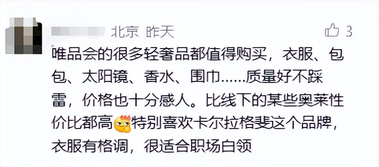 还有一位北京网友,表示尤爱唯品会轻奢。“衣服、包包、太阳镜、香水、围巾……质量好不踩雷,价格也十分感人。”甚至还对比了奥莱性价比。