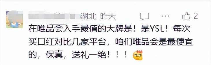 有网友则直接表白了唯品会最值得入手的品牌——YSL,称买口红对比几家平台,唯品会都是最便宜的,还保真,且送礼一绝。