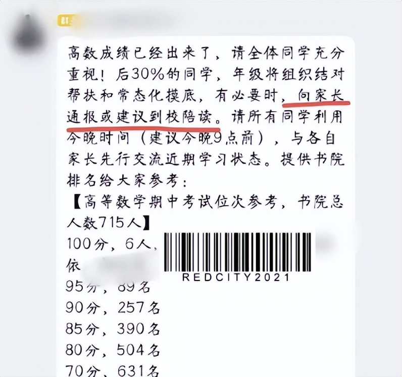 近日,有网友发文称,南京理工大学致知书院计算机2025级官方群内发布一则通知,其中提到:高数成绩现已公布,排名后30%的同学,年级将组织结对帮扶与常态化摸底,“必要时会向家长通报,或建议到校陪读”。通知还附有高数期中考试成绩位次参考,并提醒所有同学与家长提前沟通近期学习状态。