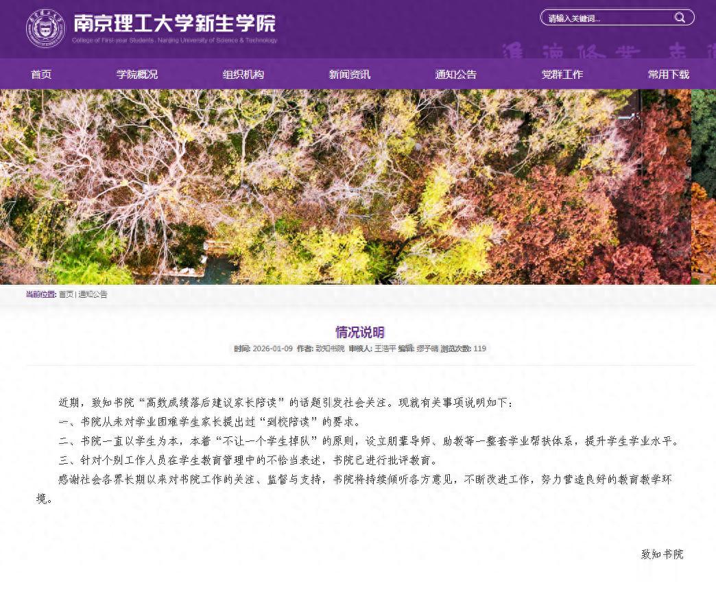 南京理工大学致知书院1月9日发布情况说明。 近期,致知书院“高数成绩落后建议家长陪读”的话题引发社会关注。现就有关事项