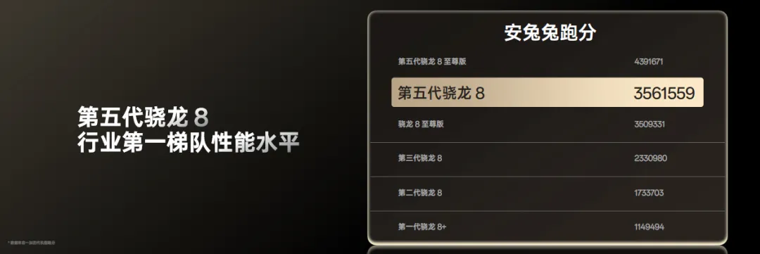 第五代骁龙8 移动平台,沿袭第五代骁龙 8 至尊版的顶级实力,两款移动平台采用相同的工艺制程、相同的领先架构。第五代骁龙8采用最先进的第三代 3nm 制程工艺,Qualcomm Oryon CPU 架构、全新的高通Adreno GPU 和 高通Hexagon NPU,第五代骁龙 8还基于「性能高效区间」优化,实现更强性能功耗更低,整体CPU性能提升36%,GPU 性能提升11%, 还支持最高165帧游戏体验。 在首发搭载的一加 Ace 6T 上,安兔兔跑分高达 356 万,性能表现跻身行业第一梯队。