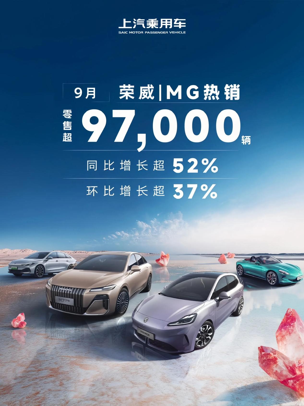 销量数据显示,2025年9月,上汽集团整车销量44万辆,夺得行业月销榜首,反超比亚迪近5万辆。上汽乘用车单月零售超9.7万辆,同比增52%、环比增37%,创年度新高。MG零售同比翻倍以上增长,荣威稳步提速,双品牌齐头并进。