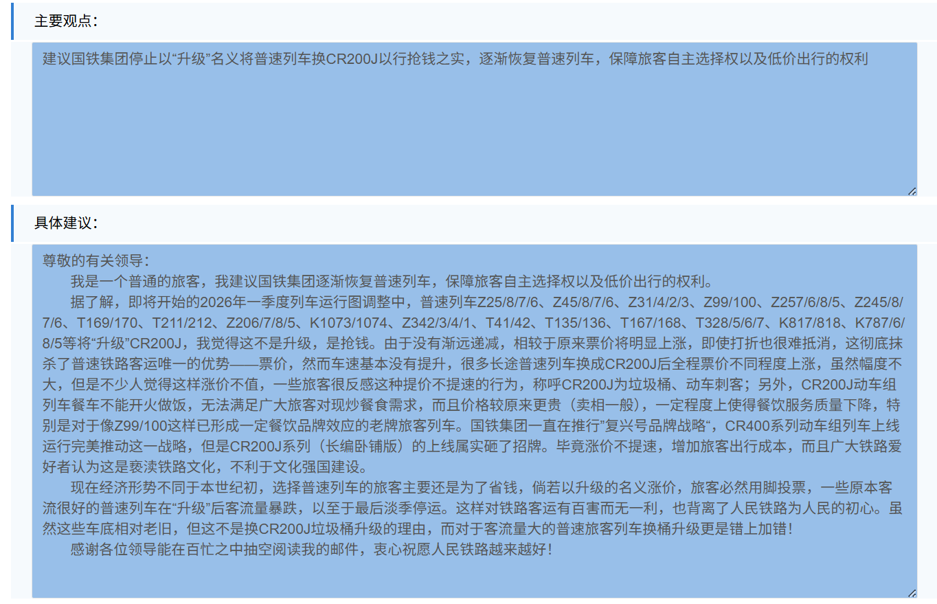 尊敬的有关领导: 我是一个普通的旅客,我建议国铁集团逐渐恢复普速列车,保障旅客自主选择权以及低价出行的权利。据了解,即将开始的2026年一季度列车运行图调整中,普速列车Z25/8/7/6、Z45/8/7/6、Z314/2/3、Z99/100、Z257/6/8/5、Z245/8/7/6、T169/170、T211/212、 Z206/7/8/5、K1073/1074、Z342/3/4/1、T41/42、 T135/136、T167/168、T328/5/6/7、K817/818、 K787/6/8/5等将“升级"CR200J,我觉得这不是升级,是抢钱。由于没有渐远递减,相较于原来票价将明显上涨,即使打折也很难抵消,这彻底抹杀了普速铁路icon客运唯一的优势票价,然而车速基本没有提升,很多长途普速列车换成CR200J后全程票价不同程度上涨,虽然幅度不大,但是不少人觉得这样涨价不值,一些旅客很反感这种提价不提速的行为,称呼CR200J为垃圾桶、动车刺客;另外,CR200J动车组列车餐车不能开火做饭,无法满足广大旅客对现炒餐食需求,而且价格较原来更贵(卖相一般),一定程度上使得餐饮服务质量下降,特别是对于像Z99/100这样已形成一定餐饮品牌效应的老牌旅客列车。国铁集团一直在推行”复兴号品牌战略”,CR400系列动车组列车上线运行完美推动这一战略,但是CR200J系列(长编卧铺版)的上线属实砸了招牌。毕竟涨价不提速,增加旅客出行成本,而且广大铁路爱好者认为这是亵渎铁路文化,不利于文化强国建设。 现在经济形势不同于本世纪初,选择普速列车的旅客主要还是为了省钱,倘若以升级的名义涨价,旅客必然用脚投票,一些原本客流很好的普速列车在“升级”后客流量暴跌,以至于最后淡季停运。这样对铁路客运有百害而无一利,也背离了人民铁路为人民的初心。虽然这些车底相对老旧,但这不是换CR200J垃圾桶升级的理由,而对于客流量大的普速旅客列车换桶升级更是错上加错!感谢各位领导能在百忙之中抽空阅读我的邮件,衷心祝愿人民铁路越来越好!