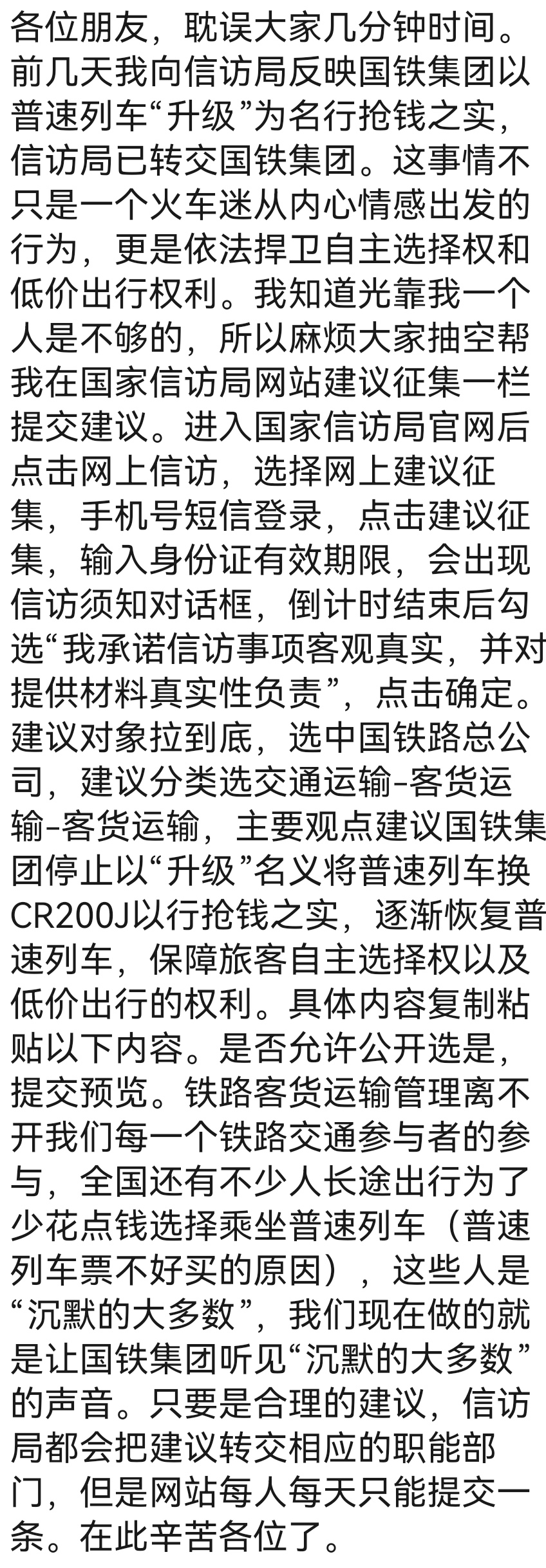 车迷朋友们,为了拯救普速列车,请积极向国家信访局提建议。具体流程见P3建议内容:尊敬的有关领导: 我是一个普通的旅客,我