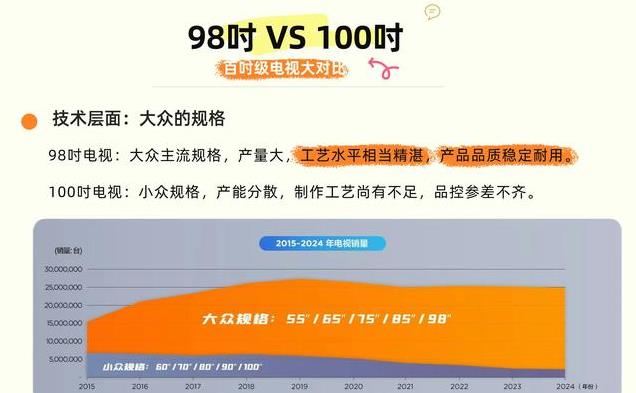 然而,随着科技的日新月异与全球化供应链网络的日益完善,大屏电视的成本得到了有效控制,其市场价格犹如下山的滑坡,持续且显著地下降。根据权威的数据统计结果显示,从2022年到现在,98吋与100吋这两个百吋级别的电视产品,在零售价格上分别实现了大约30%和40%的大幅降低,成功跨入“万元大关”,变得更加亲民,这无疑点燃了广大消费者的购买欲望。