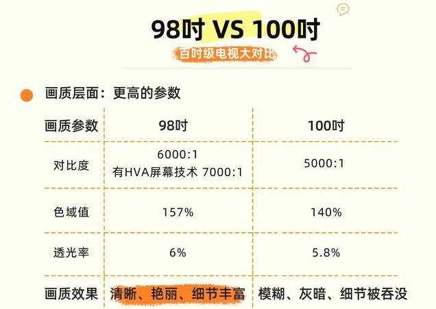但让人意想不到的是,尽管这两款电视在屏幕尺寸上仅仅相差了2英寸,可它们所带来的视觉享受却是截然不同。要说起来,98吋的电视在画质、体验以及耐用性等方面,都表现得比100吋的电视更加出类拔萃,让人不禁要探究其中的奥秘。